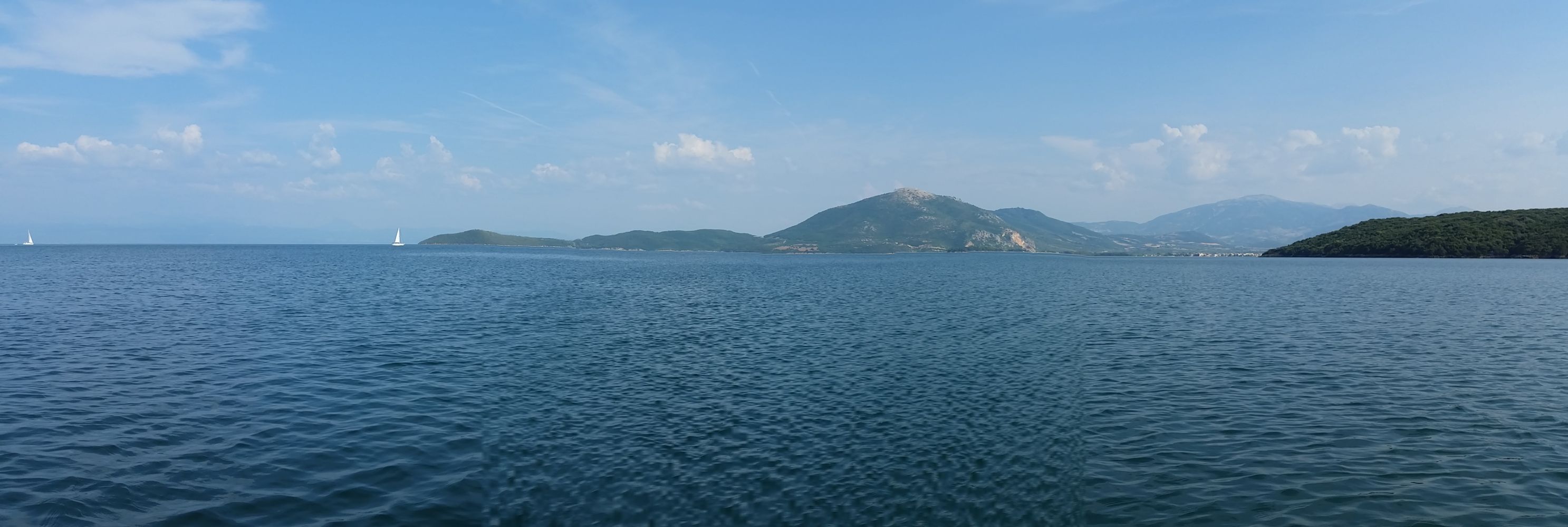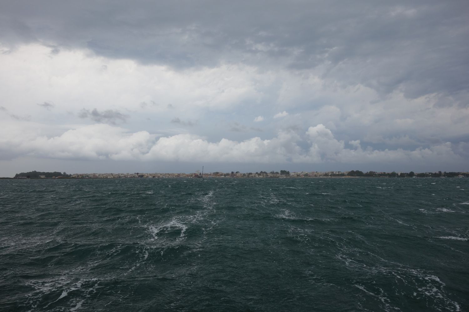 ist die Antwort auf alles. Und am Dienstag war es die Antwort auf die Frage: Wie viel Wind haben wir denn? Um genau zu sein – 42,8 Knoten. Das sind knapp 80 km/h. Und das in einem betonnten Fahrwasser – mit Untiefen in unmittelbarer Nähe. Also waren wir dann wirklich froh, dass wir schon im Ambrakischen Golf waren – hier konnten sich die Wellen nicht so hoch aufbauen und schon nach kurzer Zeit hatten wir auch eine halbwegs geschützte Ankerbucht ausgemacht. Die stand zwar als nur bedingt gute Bucht in unserem Hafenführer. Vor dem ersten Gewitter waren wir da aber erst einmal sicher. Das zog dann an uns vorbei – nur um Platz für das nächste Gewitter zu machen.