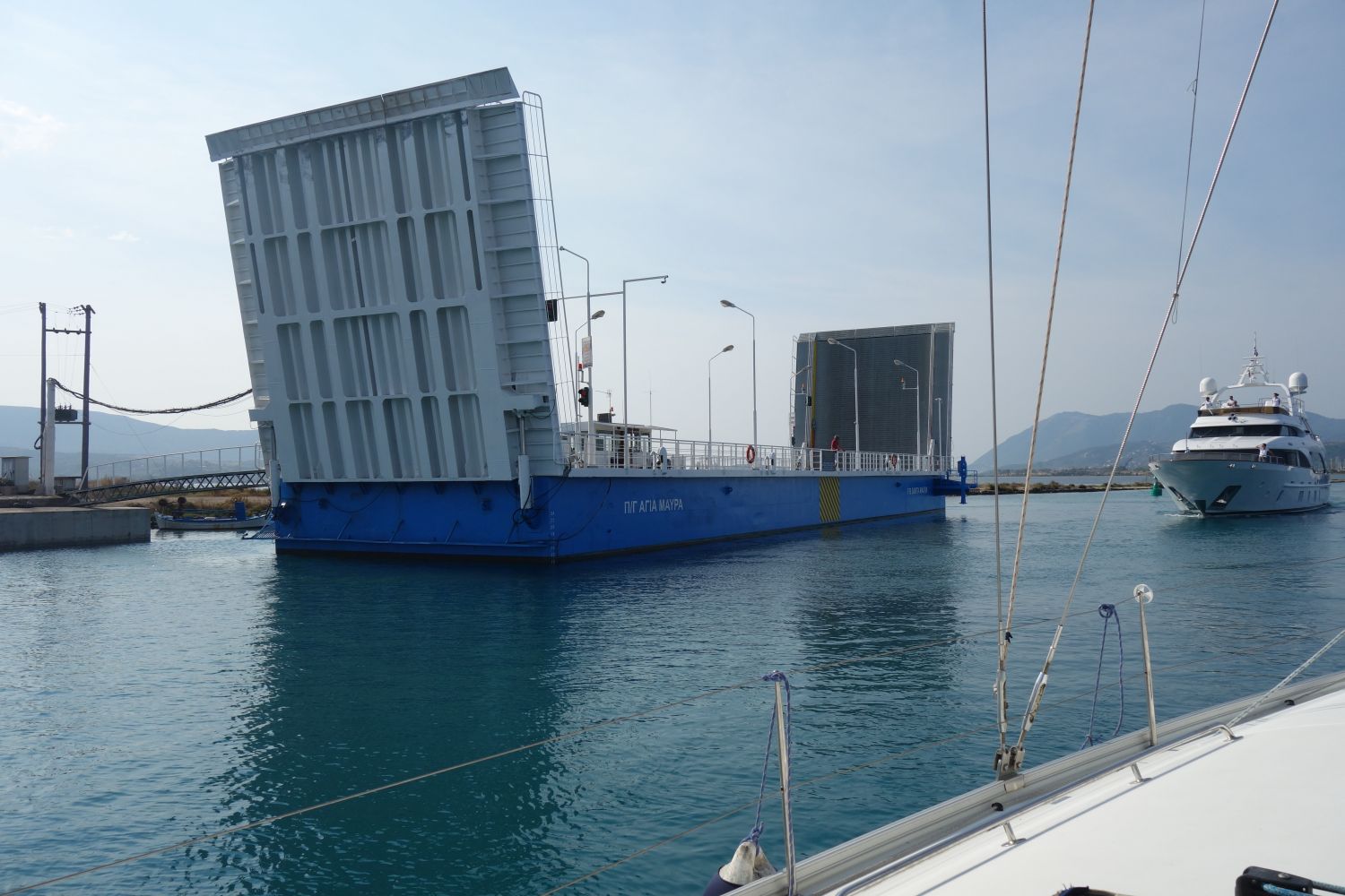 Die Entscheidung, vor dem Gewitter in den ambrakischen Golf zu laufen hat sich beim Blick auf die enge Einfahrt in den Kanal von Lefkas als doppelt richtig erwiesen: Bei mehr Wind und Welle wäre die Einfahrt nur wirklich im absoluten Notfall eine Option gewesen. Gestern morgen bei Windstille war es dann gar kein Problem. 15 Minuten vor der Öffnung der Drehbrücke waren wir Nummer 2 in der Schlange. Und jetzt sind wir nach 4 mehr oder weniger schlaflosen Nächten, einer Dinghyfahrt kurz vor dem Gewitter und einem Sonnenaufgangs-Törn nach Lefkas liegen wir in der Marina in Lefkas – und ein Blick auf den Steg bringt uns zu der Einsicht: 42 ist im Moment wirklich die Antwort auf alles.