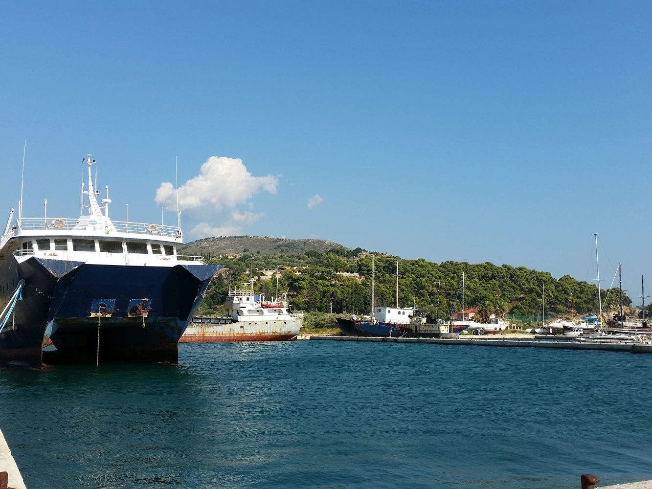 Ich kann inzwischen gut nachvollziehen, dass Odysseus irgendwann die Nase voll hatte vom umhertingeln – und dass er von seiner Frau nicht mehr erkannt wurde. Nach den Erlebnissen der letzten 24 Stunden habe ich mich selbst im Spiegel kaum mehr erkannt. Und Stefan sieht ja sowieso sehr wild aus, den erkennt eh keiner mehr. Nach einem ziemlich wilden Ritt unter Motor gegen eine total besch**** Welle (sorry, anders kann man es nicht ausdrücken) haben wir also todmüde Argostoli erreicht. Hier wurde vor einigen Jahren mit Hilfe diverser EU-Fördermittel eine Marina gebaut (und ein Kreuzfahrtterminal, eine Brücke wurde renoviert und und und). Diese Marina gehört dem griechischen Staat und sieht von oben ganz interessant aus: Die Stege sind fertig, die Festmacher-Poller montiert – nur mehr ist nicht passiert. Die Infrastruktur wurde nie fertiggestellt. Wenn man die Marina mal genauer anschaut, versteht man auch, warum: Die Haupt-Windrichtung in der Bucht von Argostoli ist Nord bis Nord-Ost. Am Nachmittag gibt es Fallböen die dann eine Welle aufbauen. Und er Marina-Eingang ist genau auf der Seite ziemlich offen. Außerdem ist die Marina für Boote bis maximal 35 Fuß konzipiert – da fahren zwar einige rum, die Mehrheit ist aber 40+