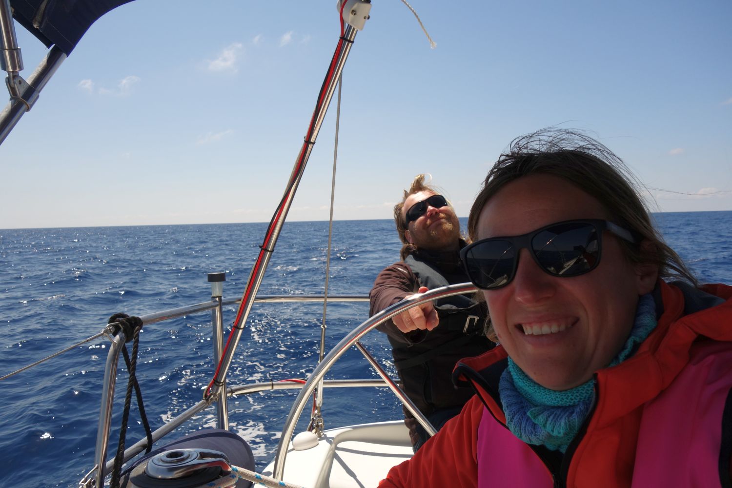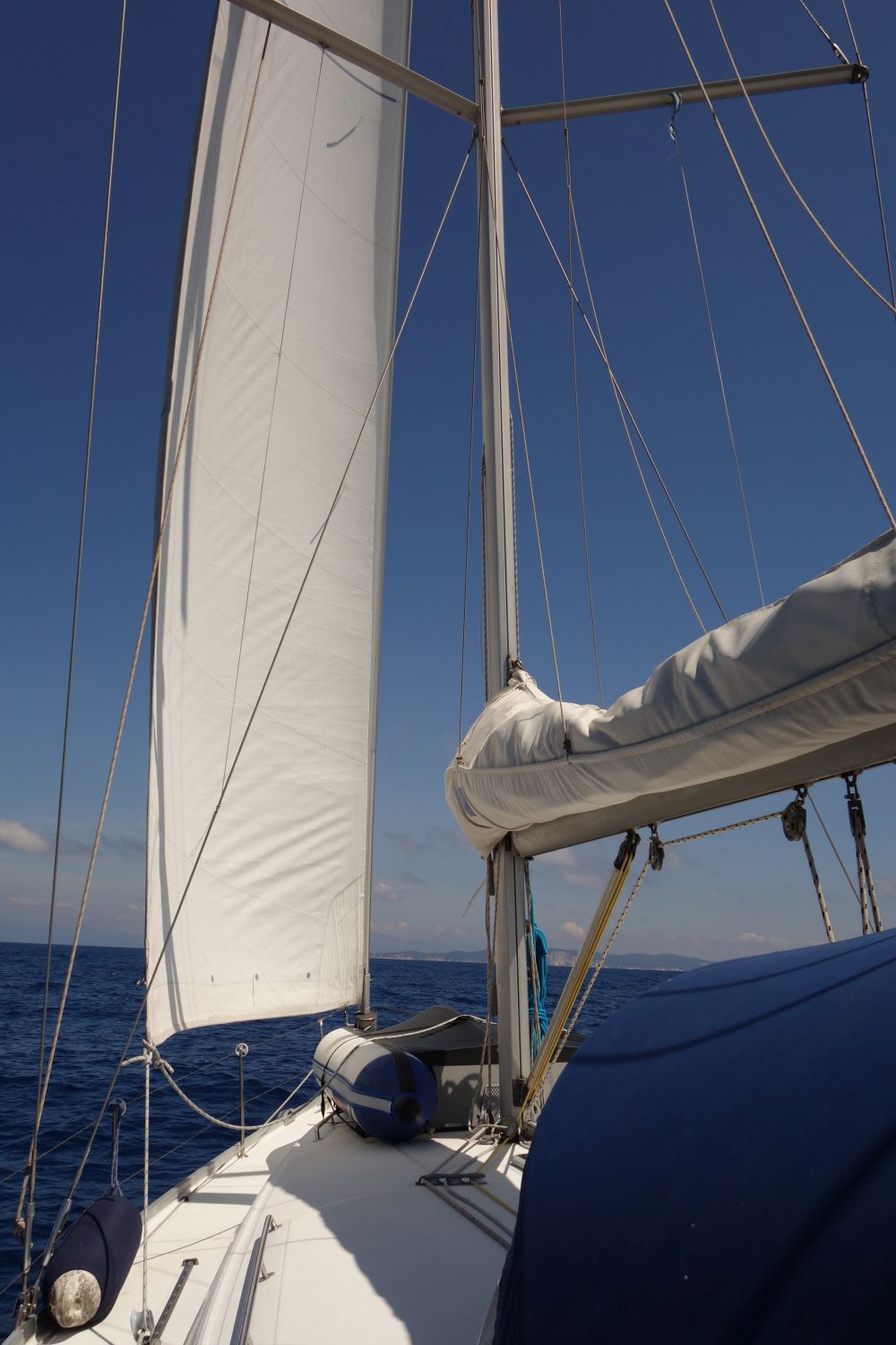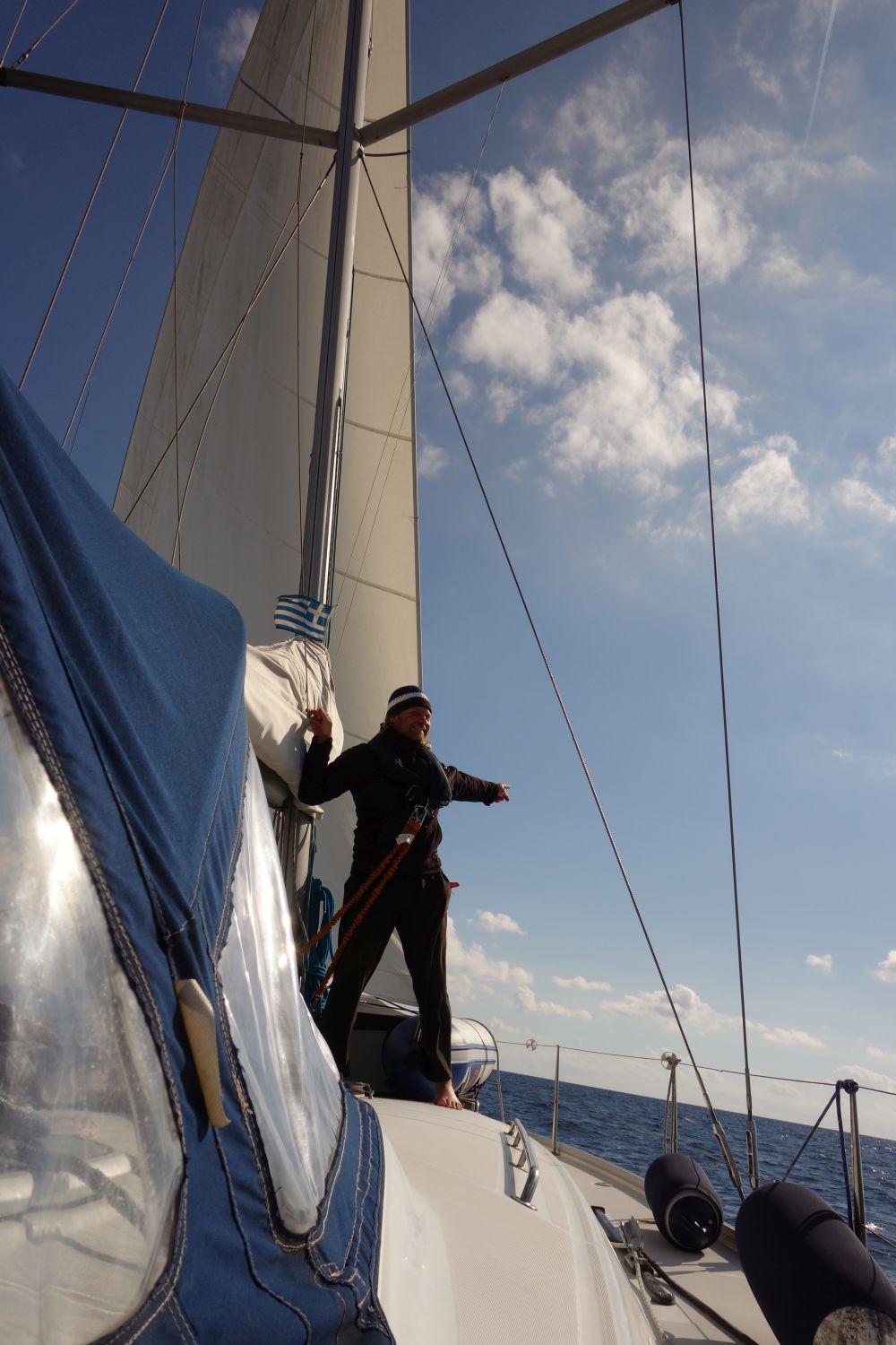 Die Nacht von Sonntag auf Montag – Mitternacht – der Wind geht auf 6 Knoten zurück und dreht um 50 Grad. Ich überlege, ob ich Jessica wecken soll, um das Großsegel zu setzen. Da bei Nachtfahrten Schlaf gold wert ist entscheide ich mich dagegen und bummle mit 3-4 Knoten weiter Richtung Lakka. Mit der Sonne kommt dann der Wind zurück und dreht zurück zum Heck – „nur“ 15-20 Knoten aber perfekt für uns. Ab da gibt es für uns eigentlich nichts mehr zu tun. Die Sundowner pflügt die nächsten 30 Stunden seelenruhig fast genau auf unserer geplanten Route (die Linie kreuzen wir 5 Mal). Ein paar Delfine kommen vorbei, ein kleiner Wal auch, wir kochen und sind begeistert, was wir erleben dürfen. Wir sind nur noch Beifahrer und halten Ausschau nach anderen Schiffen.