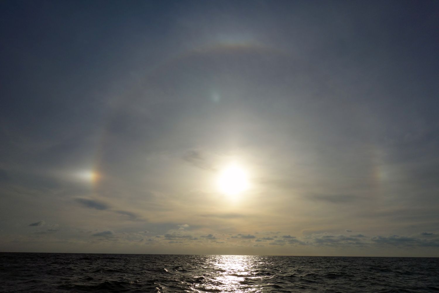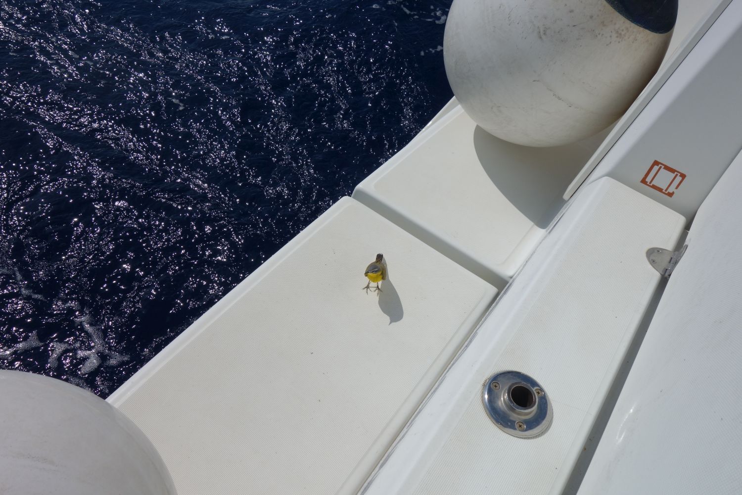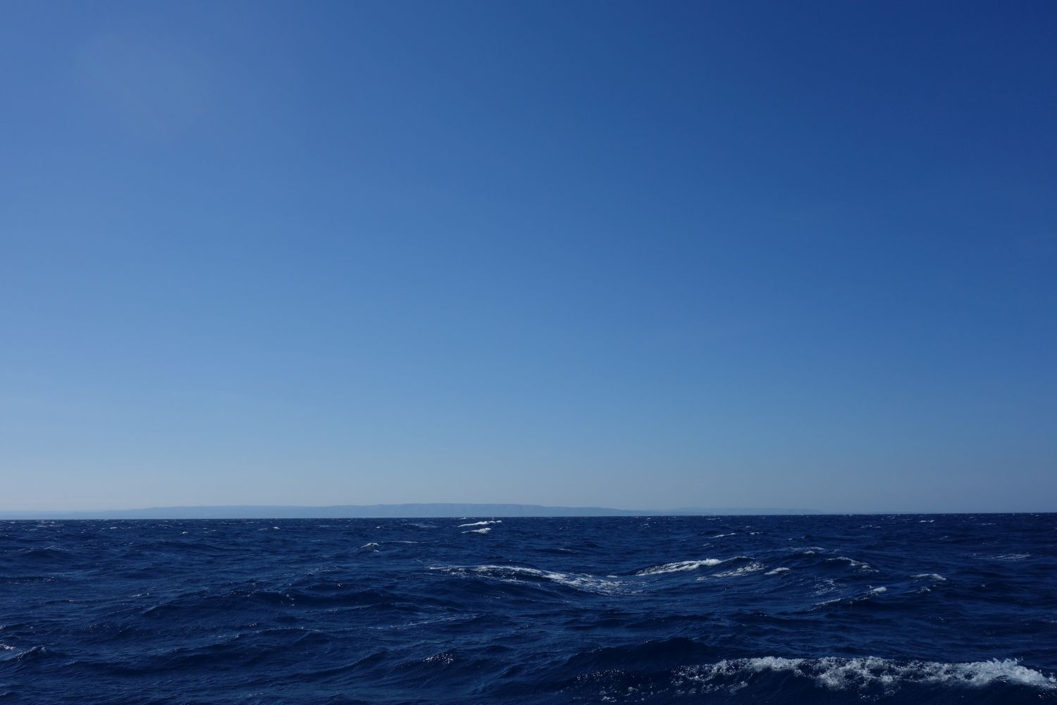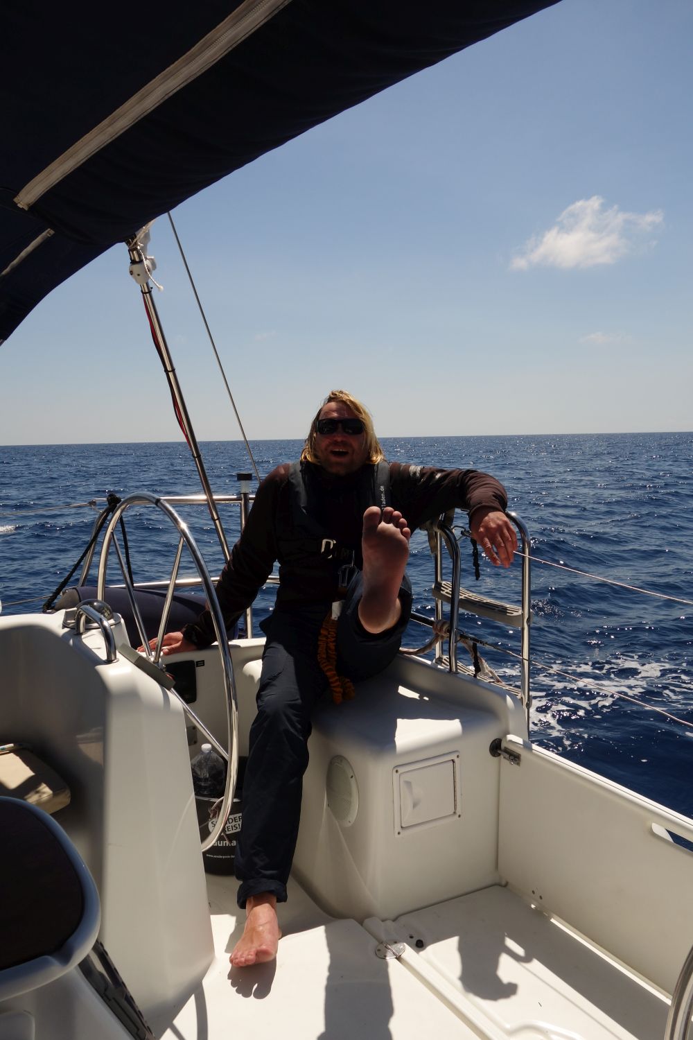 Die Nacht von Sonntag auf Montag – Mitternacht – der Wind geht auf 6 Knoten zurück und dreht um 50 Grad. Ich überlege, ob ich Jessica wecken soll, um das Großsegel zu setzen. Da bei Nachtfahrten Schlaf gold wert ist entscheide ich mich dagegen und bummle mit 3-4 Knoten weiter Richtung Lakka. Mit der Sonne kommt dann der Wind zurück und dreht zurück zum Heck – „nur“ 15-20 Knoten aber perfekt für uns. Ab da gibt es für uns eigentlich nichts mehr zu tun. Die Sundowner pflügt die nächsten 30 Stunden seelenruhig fast genau auf unserer geplanten Route (die Linie kreuzen wir 5 Mal). Ein paar Delfine kommen vorbei, ein kleiner Wal auch, wir kochen und sind begeistert, was wir erleben dürfen. Wir sind nur noch Beifahrer und halten Ausschau nach anderen Schiffen.
