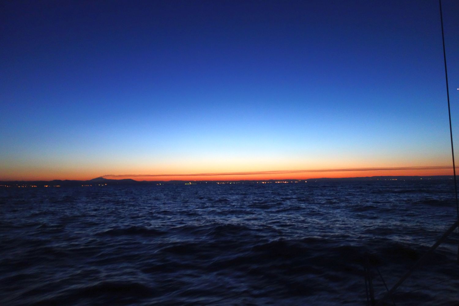 Der Wind kommt dann mit der Sonne – direkt von hinten, wir setzen das Groß und gehen wieder vor den Wind. Dann schauen wir uns die Sache erst einmal ein paar Minuten an. Blöd, das Großsegel will nicht richtig stehen und trotz Bullenstander ruckt der Baum immer wieder ein. Da erinnern wir uns an ein BBQ vor ein paar Wochen, bei dem Jenna erzählt hat, dass sie ganz oft nur mit dem Vorsegel unterwegs sind. OK, die haben einen Katamaran – aber unsere Sundowner liegt eigentlich auch sehr gut in der Welle. Also: Groß runter, Genua raus.