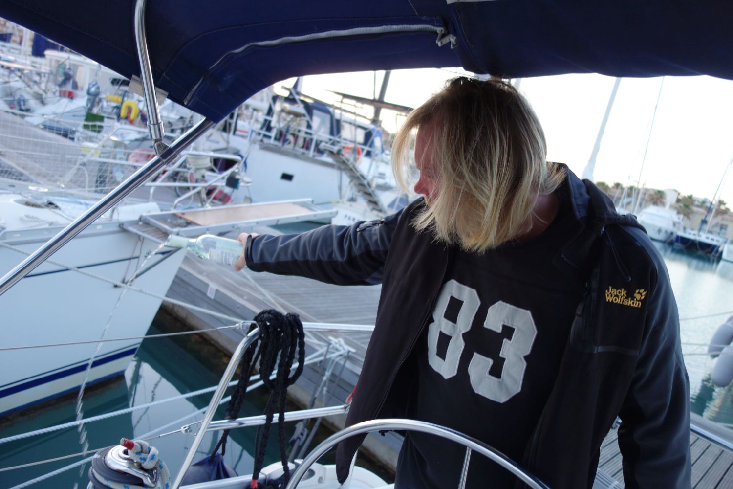 352,8 Seemeilen in 2 Tagen und 11 Stunden inklusive ablegen und ankern mit nur einem Segel – gar nicht so schlecht. Als ich dann nach unten gehe, sehe ich, dass wir vergessen haben, den Wassertank unserer Senseo-Kaffeemaschine auszuleeren. Die bleibt immer in der Galley stehen. Kein einziger Tropfen Wasser ist ausgelaufen. Und wir haben im Cockpit keinen einzigen Tropfen Salzwasser abgekommen – bei immerhin bis zu 29,7 Knoten Wind und der bekannten kurzen Mittelmeerwelle.