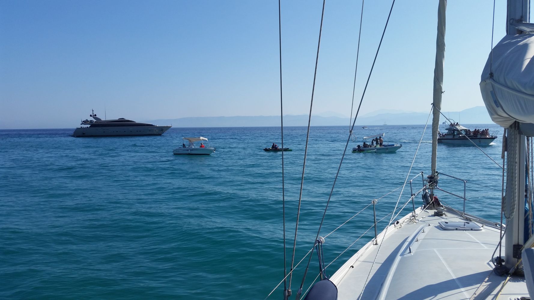 Auf der Rückfahrt nach Korfu waren wir dann in einer Bucht, in der wir letztes Jahr auch schon mal geankert haben – und bei der wir immer den Namen nachschlagen müssen, irgendwie will der nicht im Kopf bleiben. Die „Bucht ohne merkbaren Namen“ war ruhig und der kurze Schlag am nächsten Vormittag nach Paxos bot wieder traumhafte Segelbedingungen.