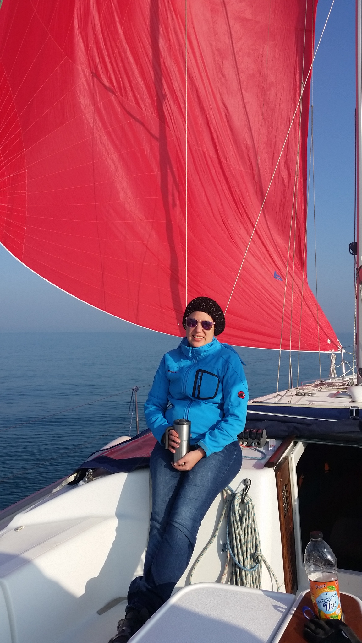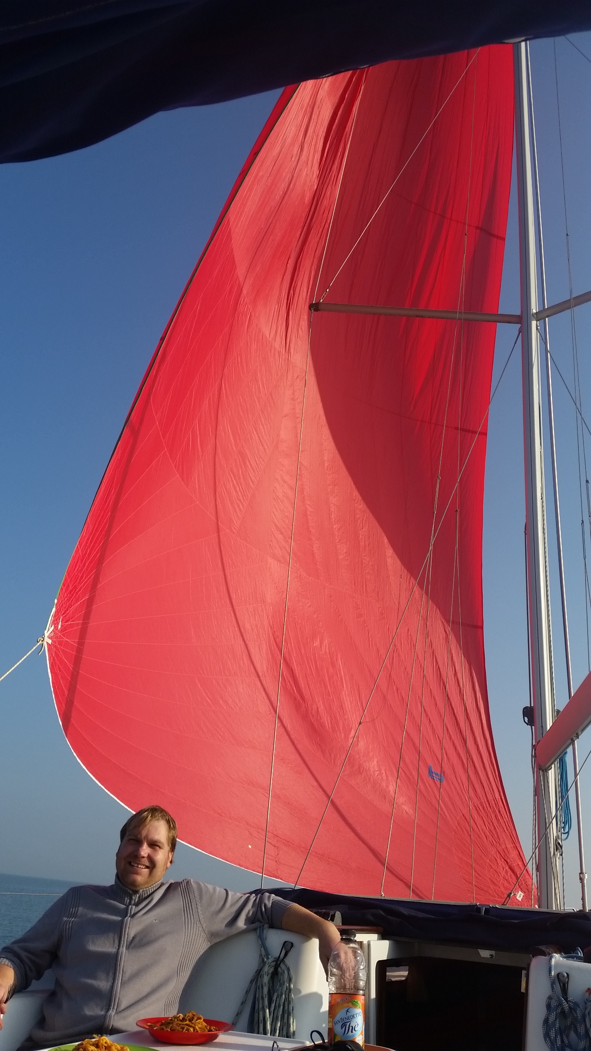 Nachdem wir die letzten Tage eigentlich immer gefroren haben, war es heute erstaunlich warm und wir hatten sogar unglaubliche 2 Knoten Wind. Genug für den Gennaker. Den haben wir auch ohne wesentliche Probleme gesetzt – und konnten dann sogar gemütlich den Rest Pasta asciutta von gestern warm machen und draußen im Cockpit essen. So habe ich mir das vorgestellt. Pünktlich zum Kaffee hat der Wind auf sage und schreibe 4 Knoten aufgefrischt – und die Sundowner hat das in fast 4 Knoten Geschwindigkeit umgesetzt. Sehr erfreulich.