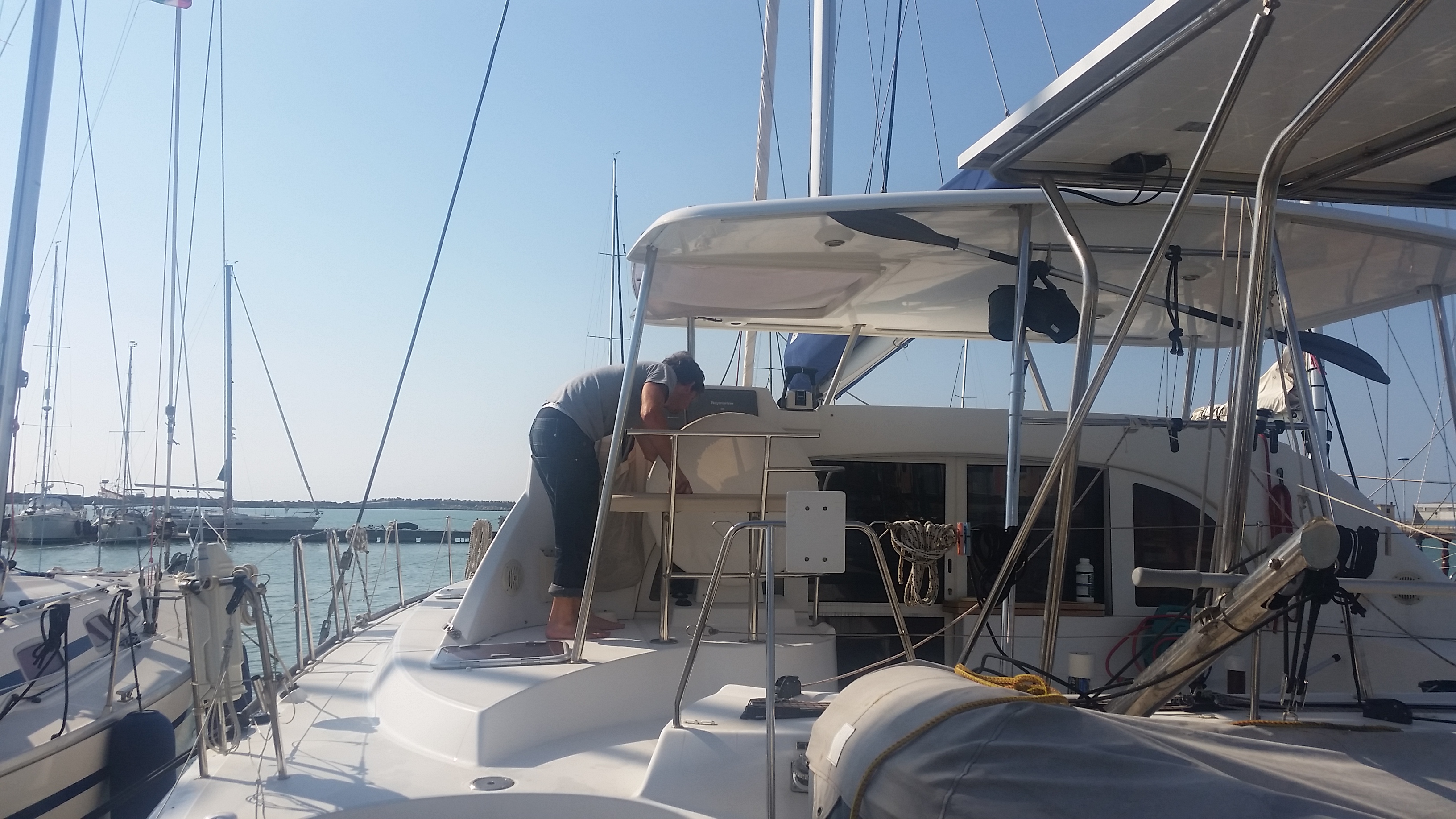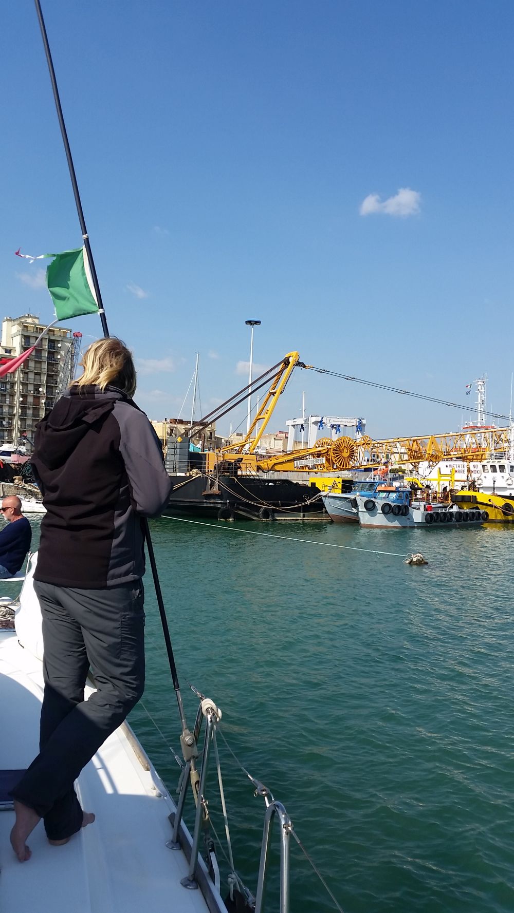 Da es hier ja nun leider doch eben Wind, Gewitter und eben ganz allgemein Wetter gibt, löst sich hier mal eine Abdeckung und da mal ein Schäkel. Als abwesender Winterlagerer geht man ja davon aus, dass sich die Marina dann schon kümmert. Aber hier ist Sizilien und hier ist das eben anders. Da ist dann eben eine Leine lose und keinen kümmerts. Außer eben uns und die anwesenden Yachties. Immer wieder sieht man uns und unsere Mitbewohner auf Nachbaryachten kraxeln und Leinen festzurren, Biminis abbauen und Abdeckungen befestigen. Eine bewohnte Marina hat eben doch Vorteile. Und zum Glück leiden wir hier alle irgendwie an einem Helfersyndrom. Gemeinsam Segel montiert, Stromlecks suchen oder Motoren warten. Jeder hat Erfahrungen, die er gerne teilt.