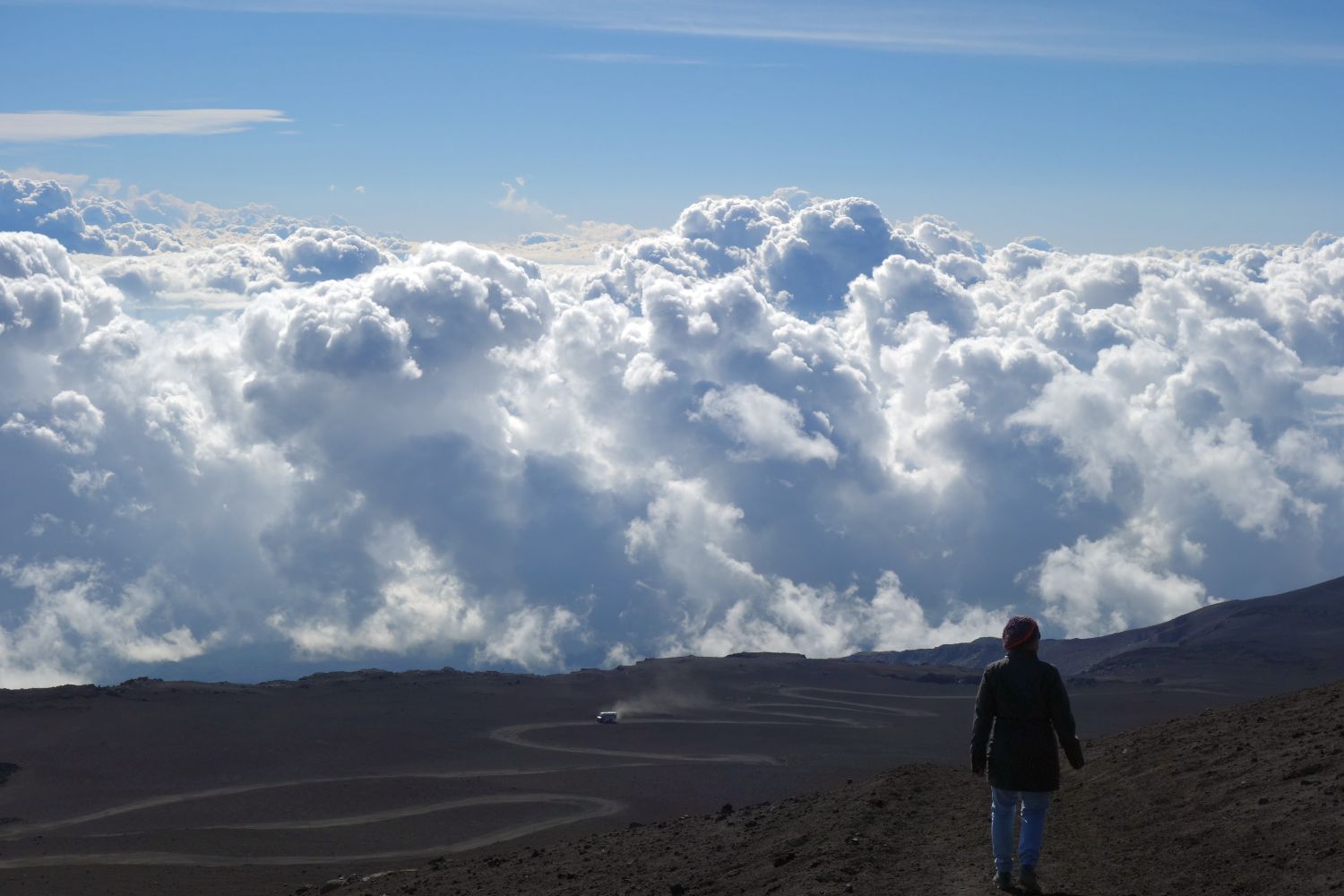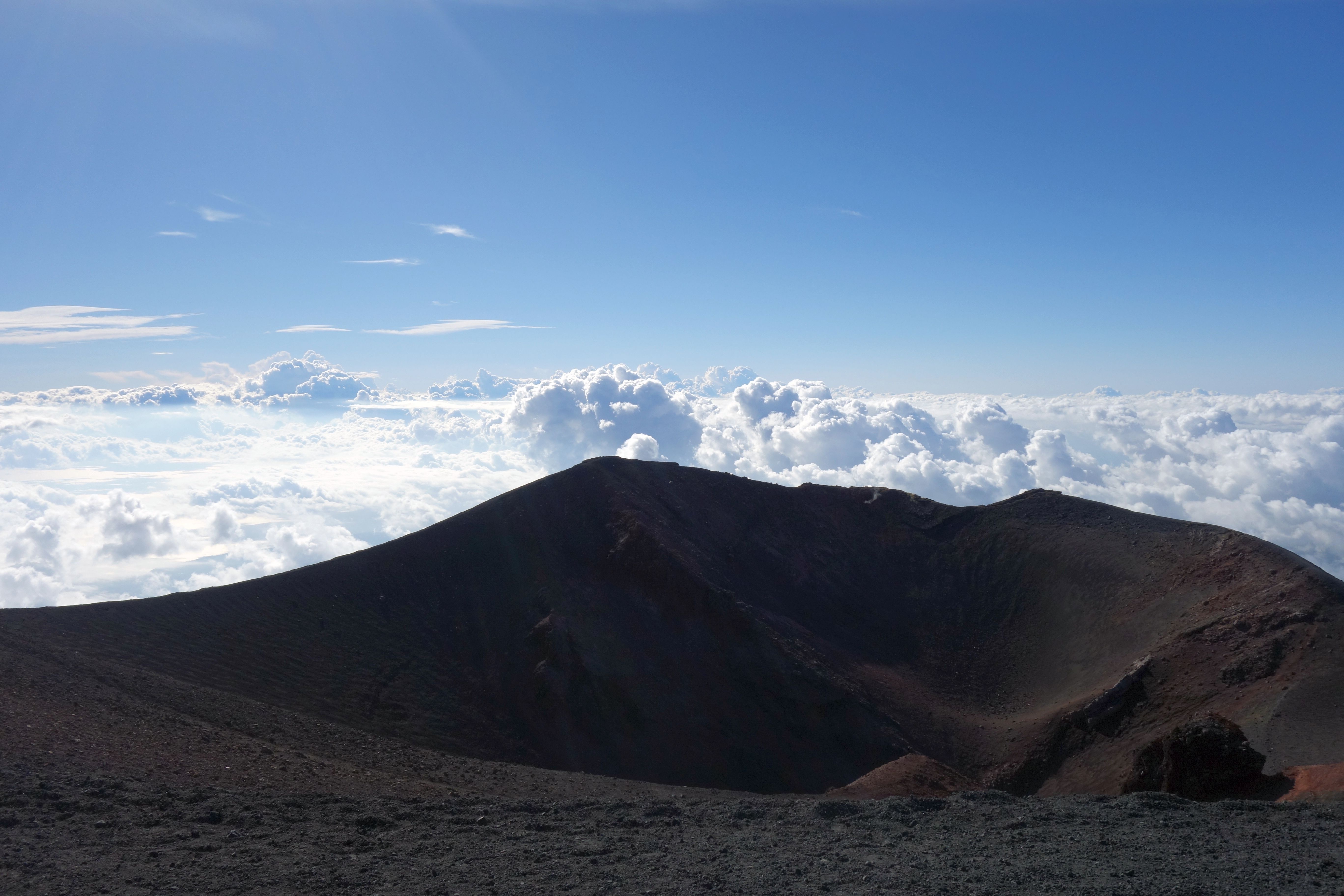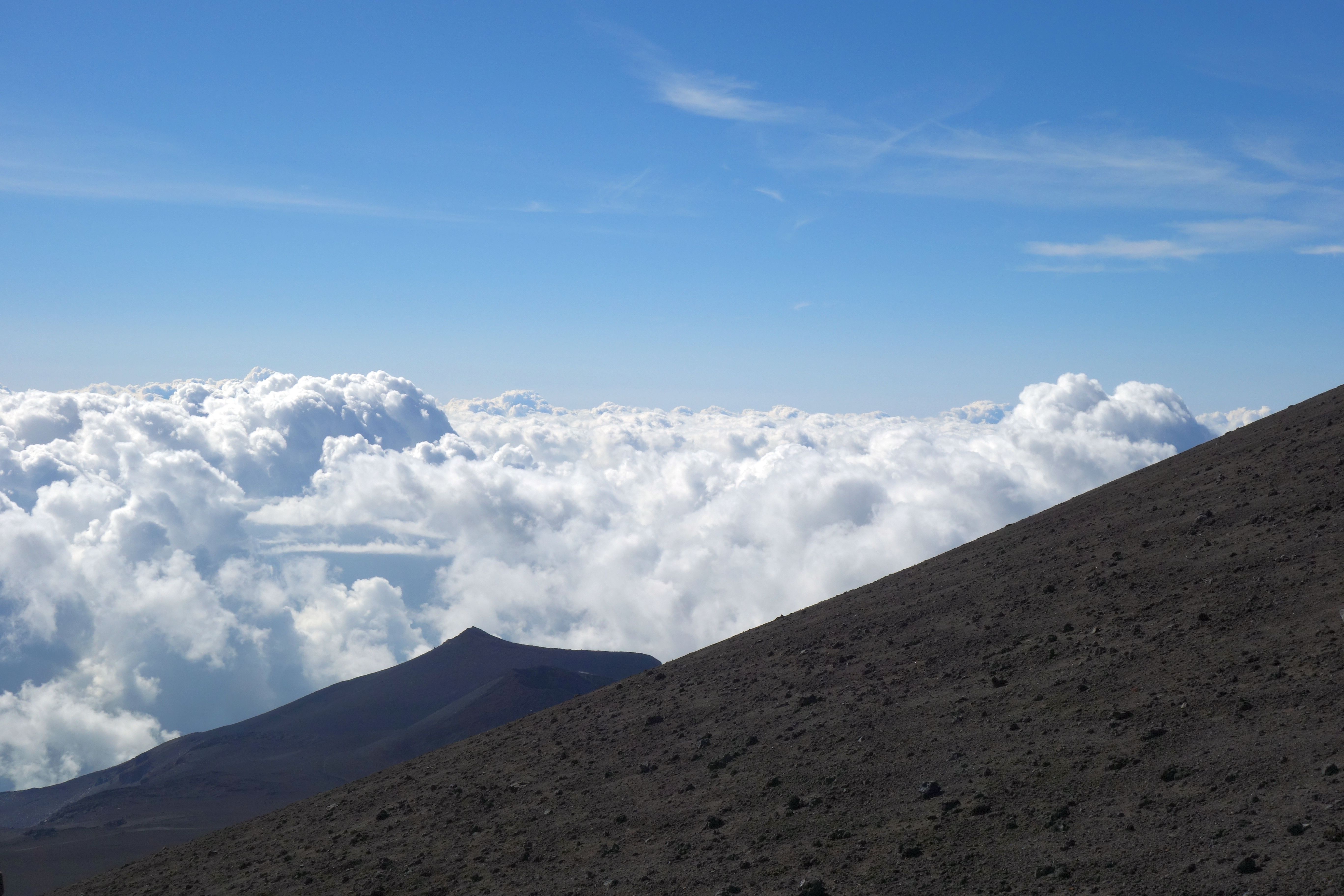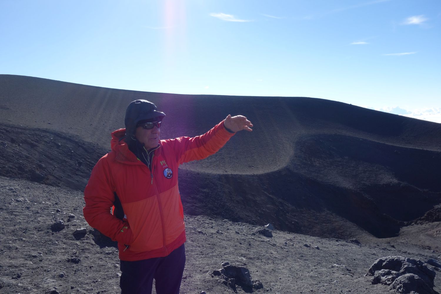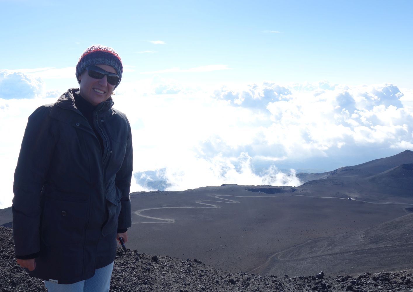 So weit oben, weg von allem kann man sich schon vorstellen, dass man hier oben ohne Probleme die Mondlandung nachstellen kann. Über den Wolken – ein irres Gefühl. Und dass der Vulkan noch aktiv ist, kann man sehen – es dampft aus den Gipfelkratern, aus kleinen Erdlöchern und sobald man selbst ein bisschen gräbt, spürt man die Hitze.