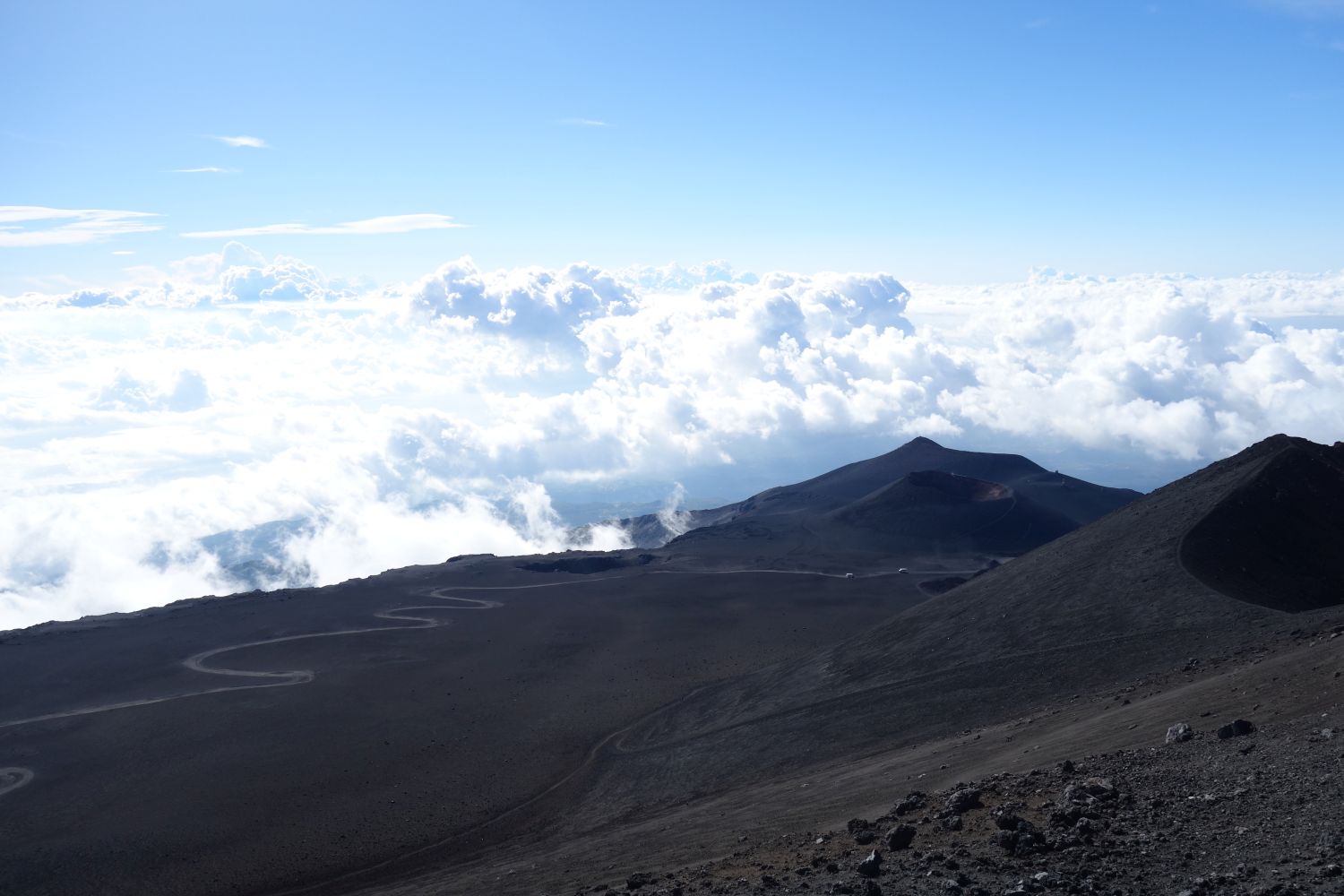 Auf dem Weg zum Etna haben wir erst einmal nichts gesehen. Der Vulkan hat sich in Wolken gehüllt – das sah dann aber oben viel besser aus als erwartet – so ganz abgeschnitten von allem nur Wolken und Vulkan, das ist ein Gefühl, als wären wir irgendwo aus der Welt gefallen.