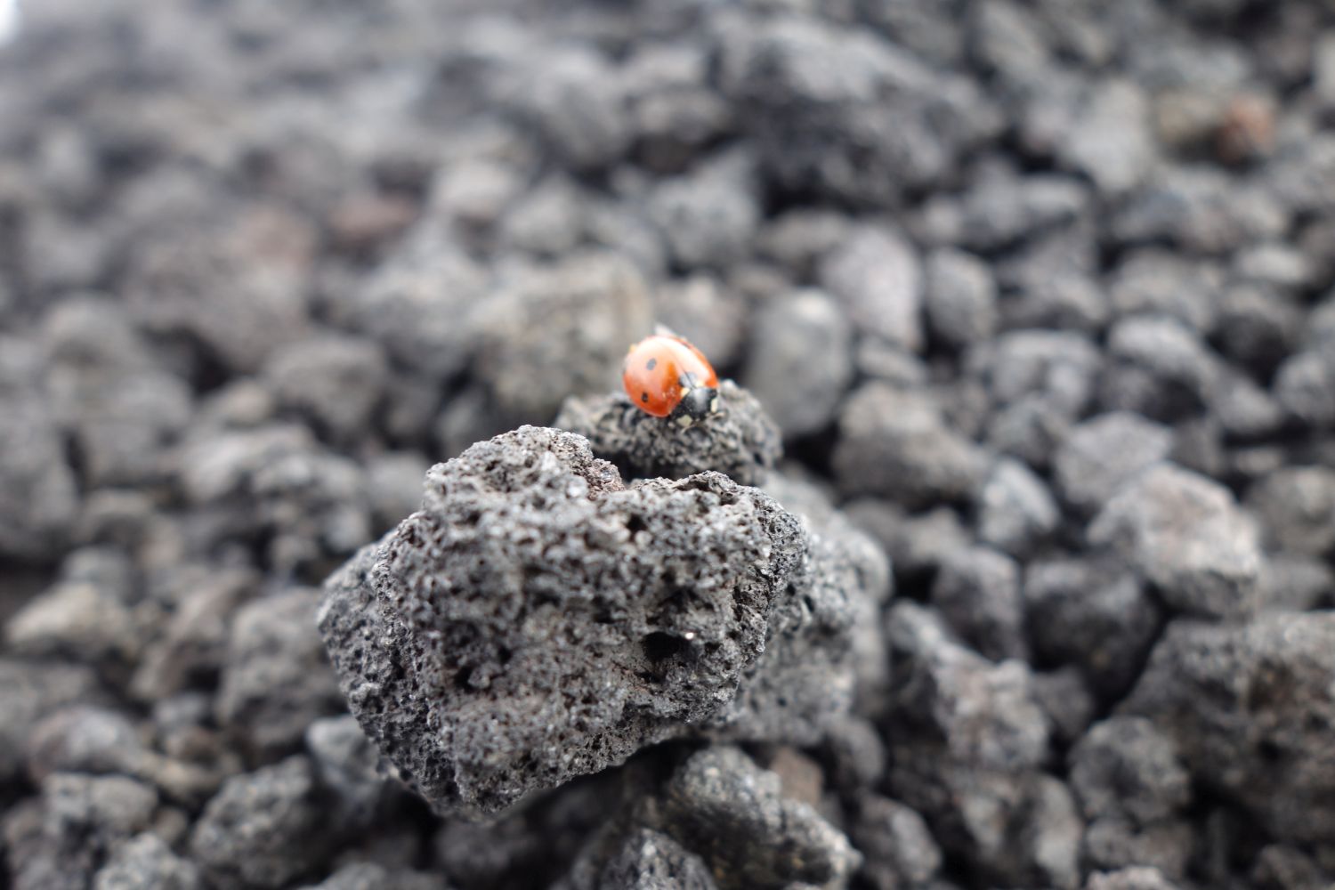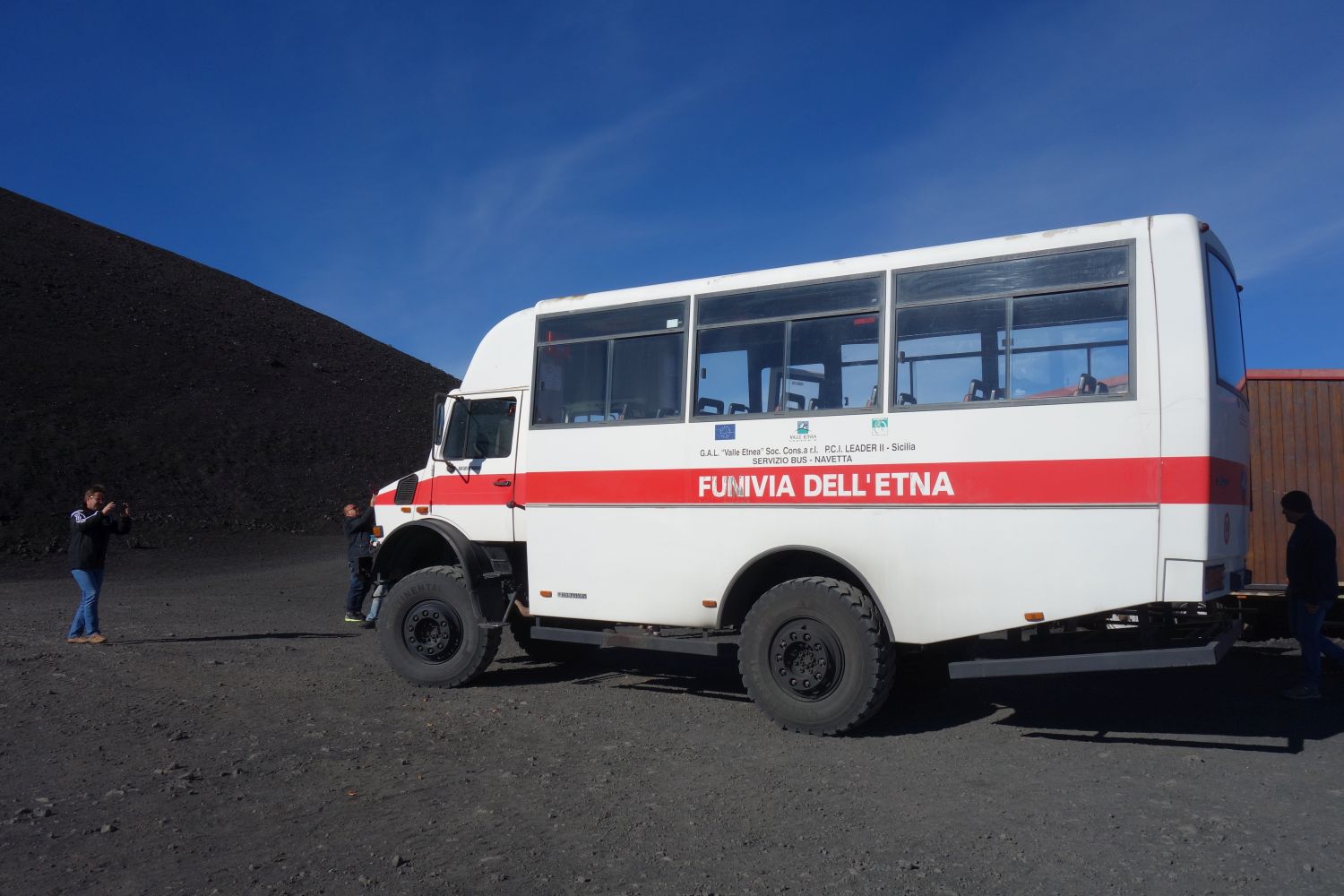 Oben warteten dann schon die Unimogs, um uns in das „genehmigte Kratergebiet“ zu bringen. Auf 2.957 Metern wartete dann ein Bergführer, der unserer Gruppe in einer Mischung aus italienisch, englisch und deutsch die Krater der letzten Ausbrüche zeigte. Ganz hoch darf man zur Zeit nicht, der Etna „blubbert“ zur Zeit zu stark. Auf fast 3.000 Metern war es dann schon sehr kalt – so um die Null Grad – und sehr unwirtlich. Das stört allerdings die italienischen Marienkäfer nicht – die verstecken sich in Bodennähe.