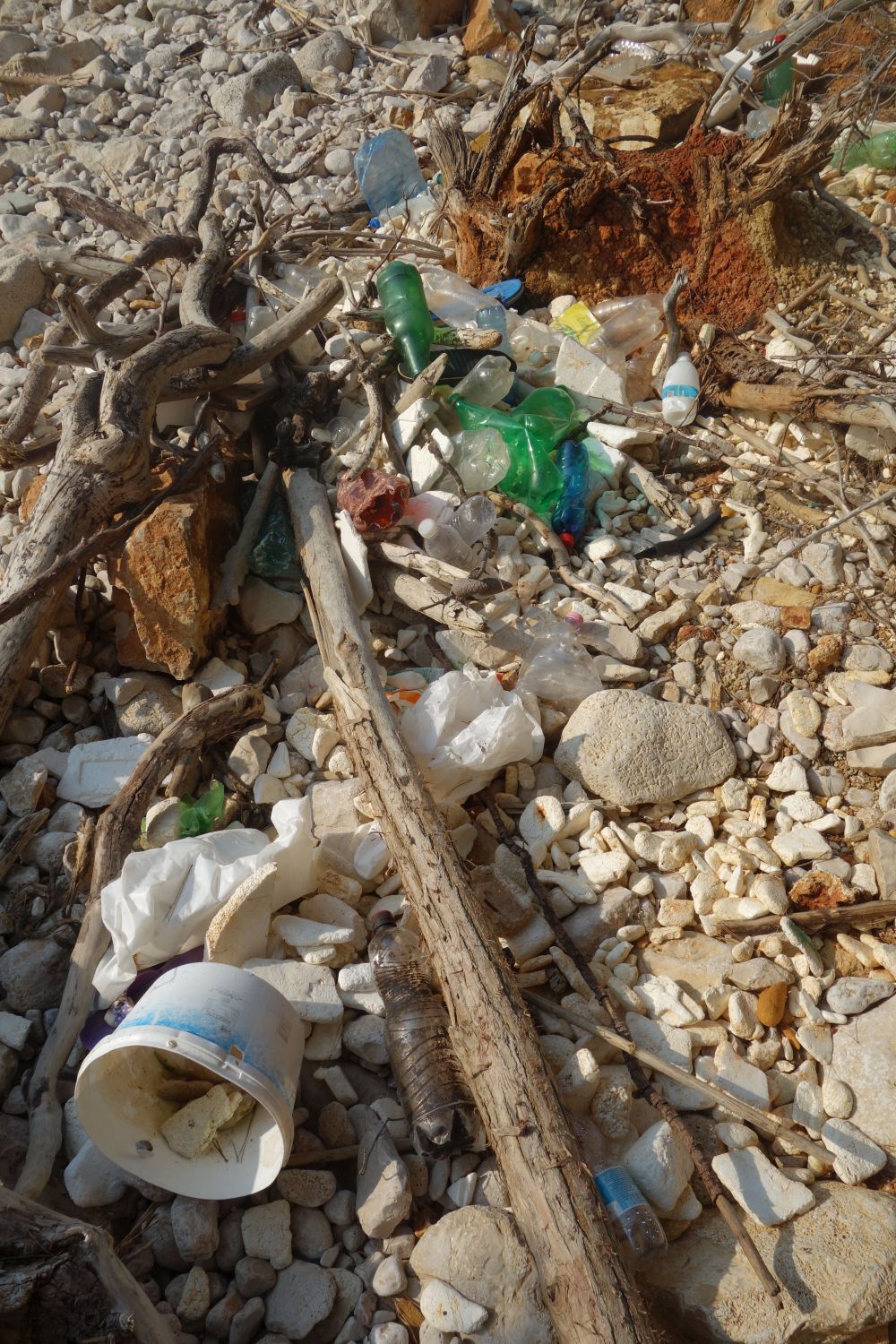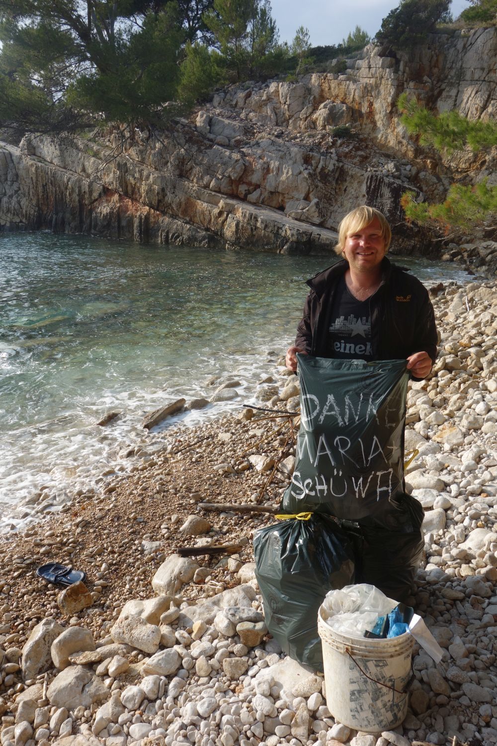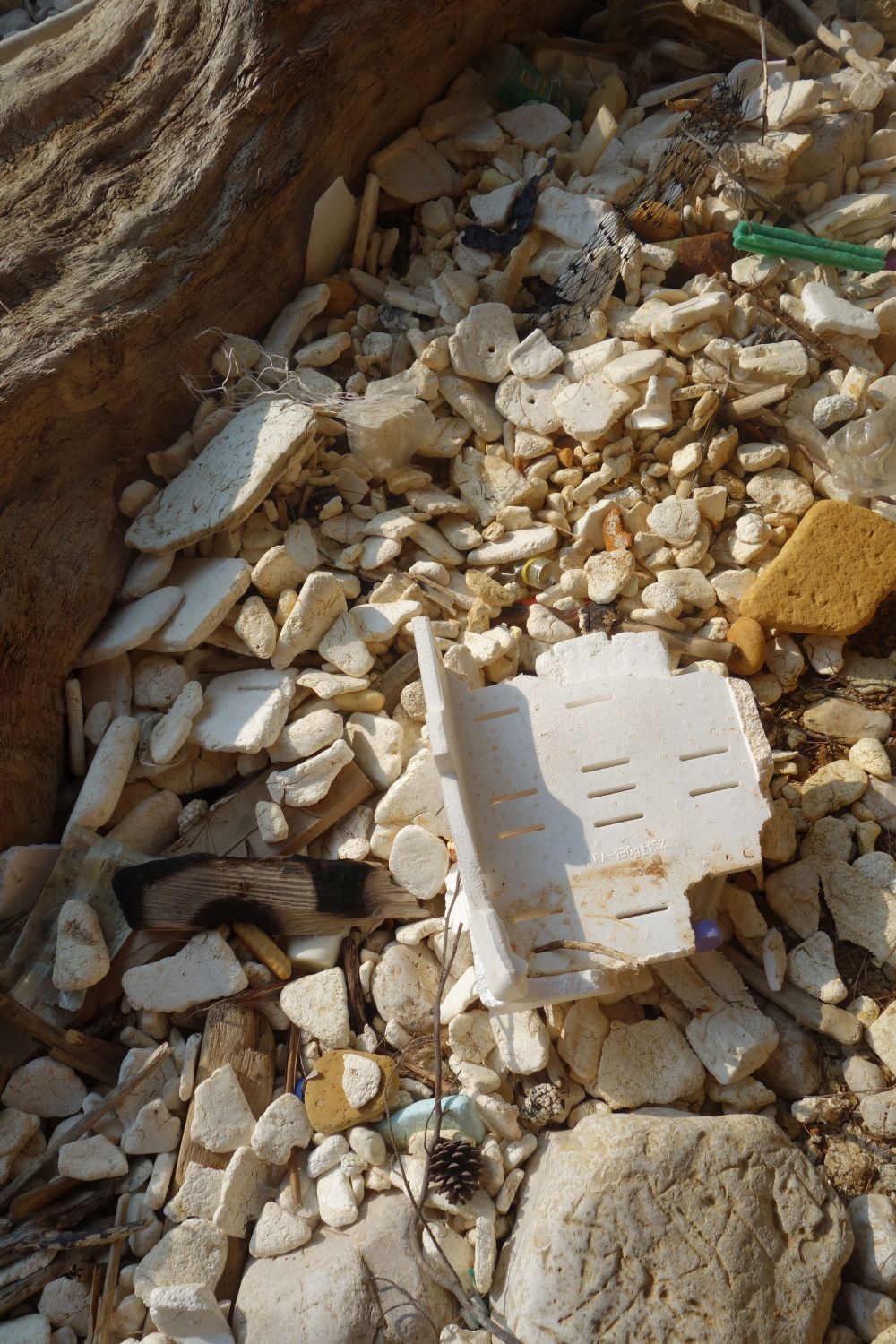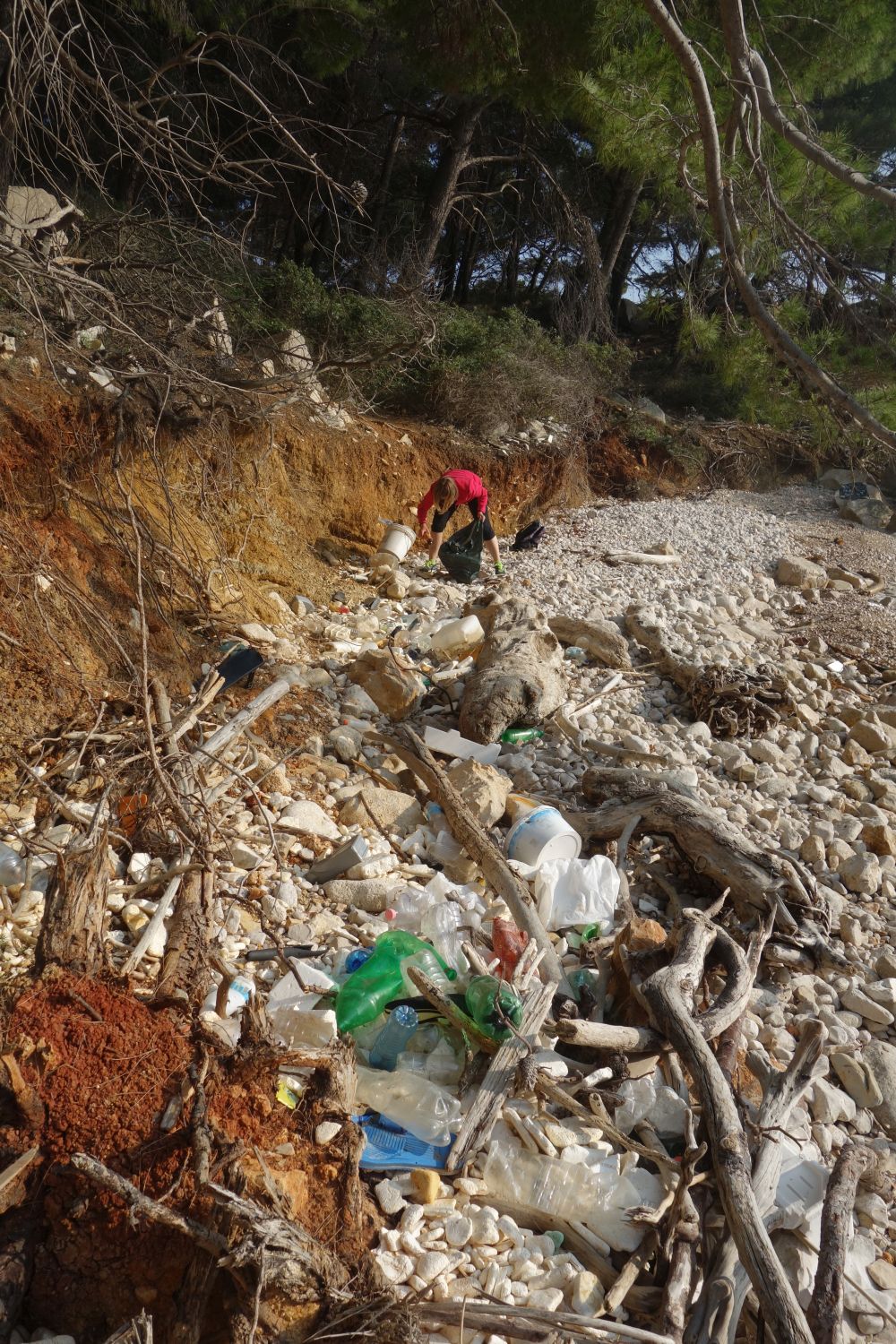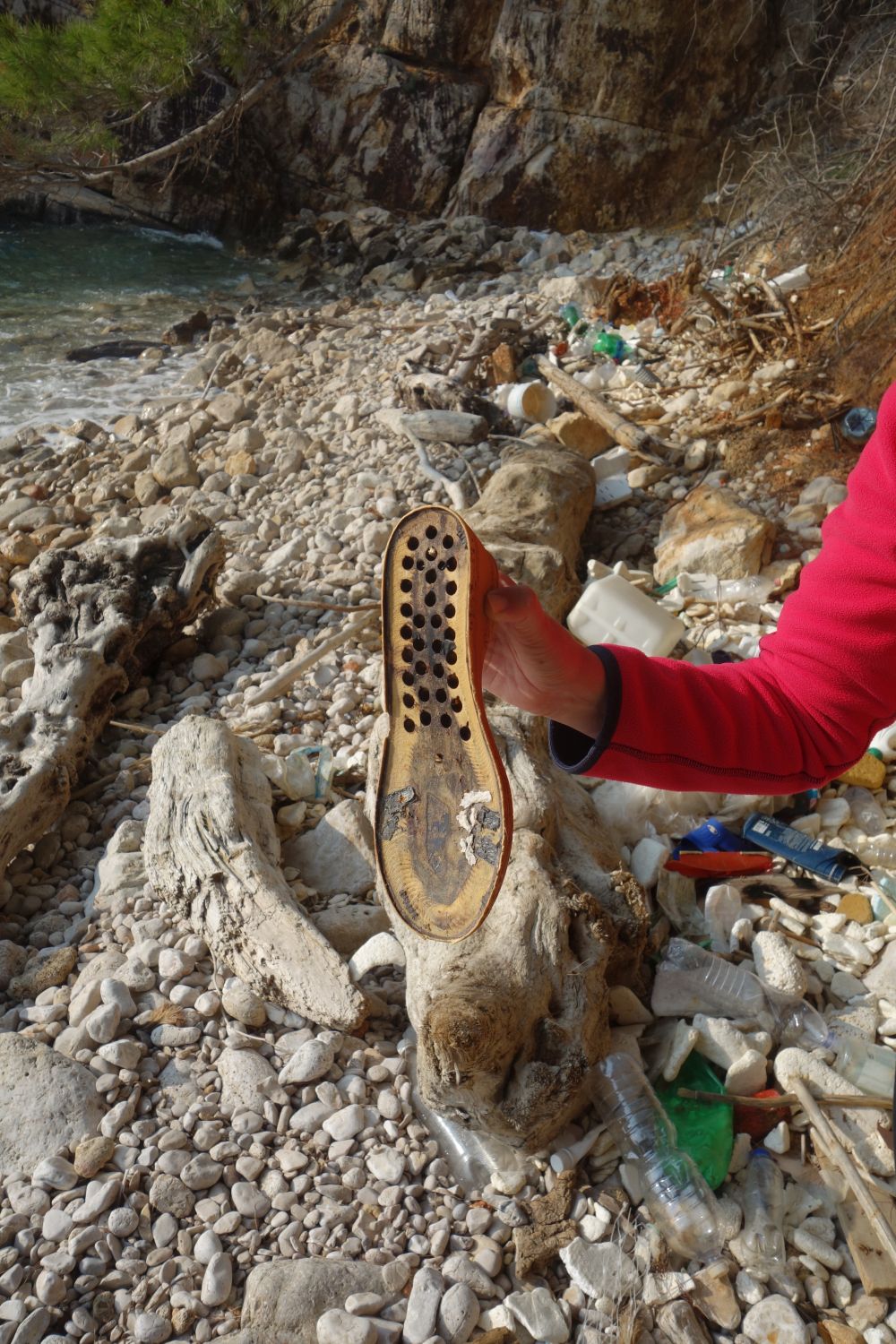 schöne weiße Steine“. Bei genauerer Betrachtung haben sich die Steine allerdings als Styropor-Müll entpuppt. Hunderte Plastikflaschen, Bauschaumdosen, Schuhe, Fußbälle, kiloweise Styropor. Und kaum hat man alles weggesammelt wird schon die nächste Ladung angeschwemmt. Hier in dieser Bucht hat in den letzten Monaten niemand aufgeräumt. Der Plastikmüll liegt hier in mehreren Schichten, zum Teil sind die Müllberge einen halben Meter hoch. Es gibt hier
