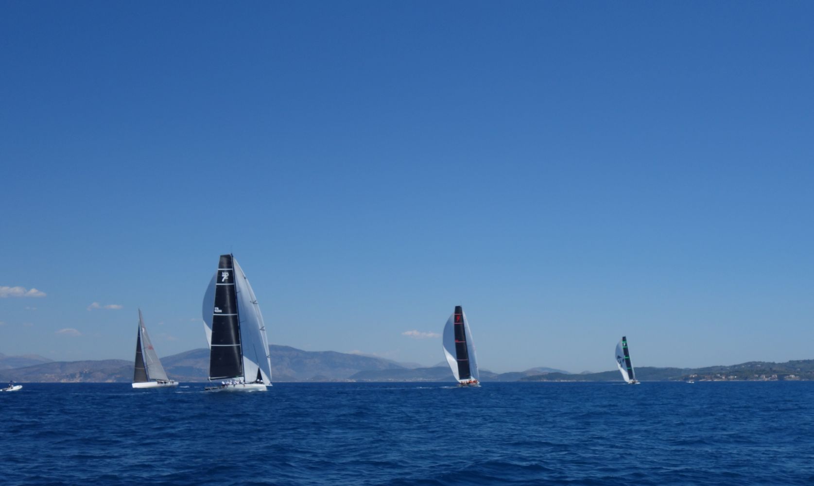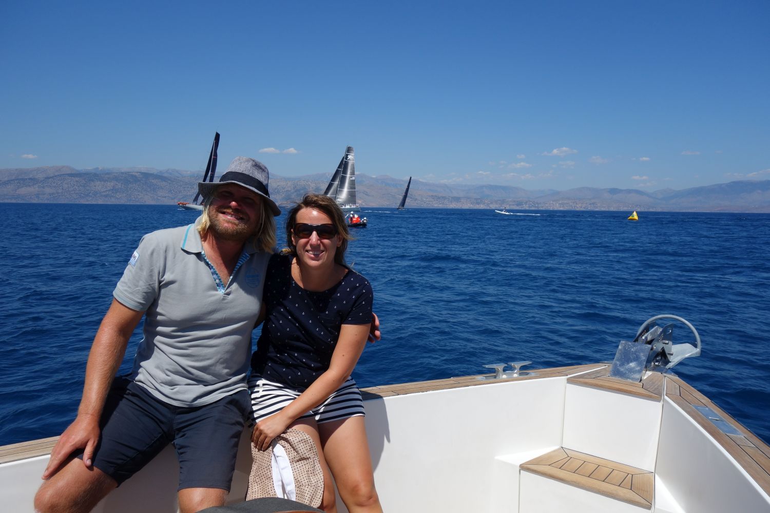 Umso überraschter waren wir dann über die Einladung, am Freitag auf dem Media-Boot mitzufahren. Das hat schlappe 1200 PS und für die 14 Seemeilen zur Rennstrecke braucht man 30 Minuten. Und das Media-Boot hatte Platz. Zusammen mit einem Sportjournalisten aus Athen und dem Redakteur des ONDECK-Magazins sowie einigen sehr hübschen und offensichtlich sehr reichen Damen rasten wir mit bis zu 30 Knoten in den Norden Korfus. Die 2 Rennen, die wir beobachten konnten waren sehr abwechslungsreich – es gab zwei unterschiedliche Sieger, das Team Bella Mente und das Team Cannonball.