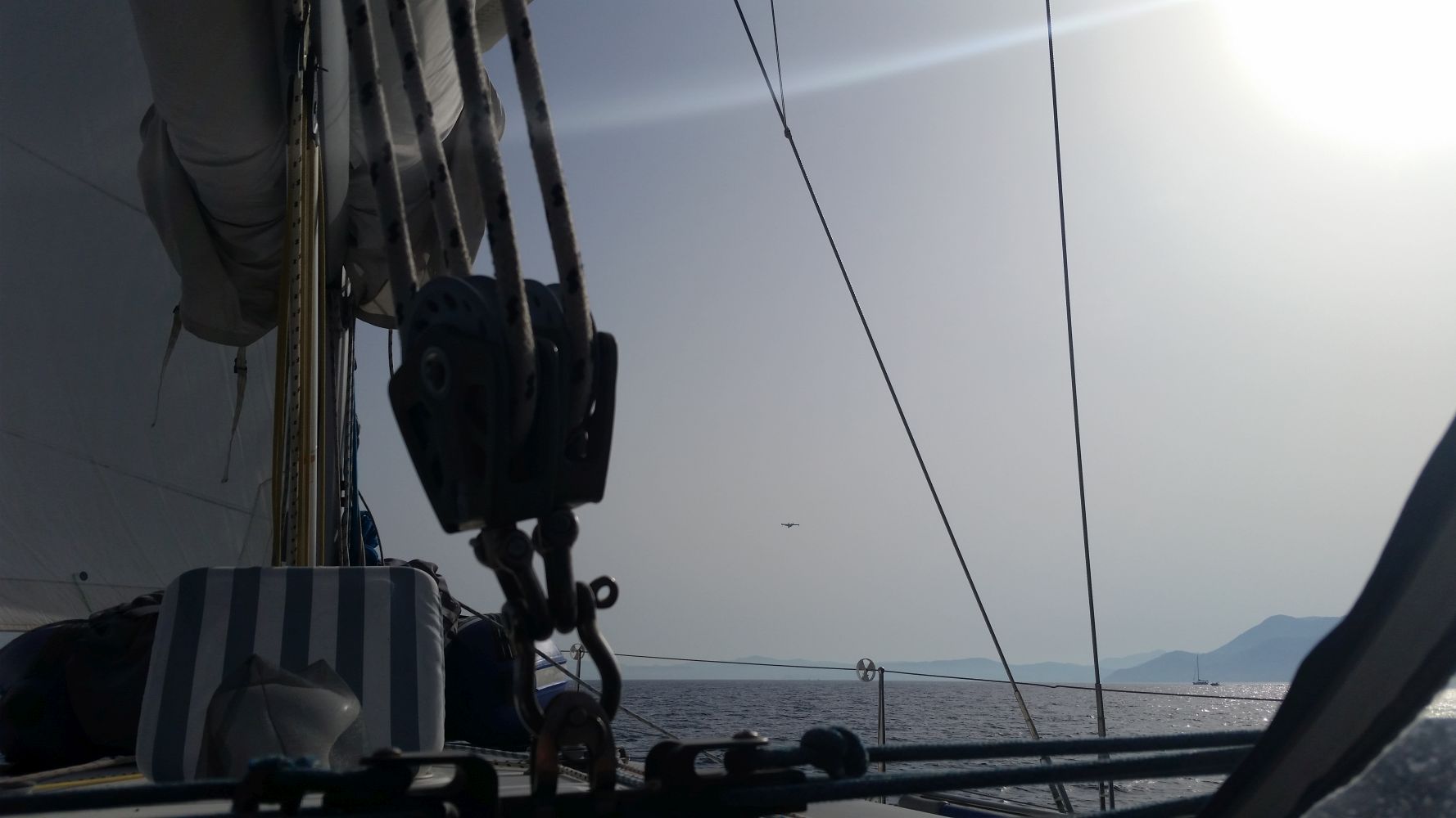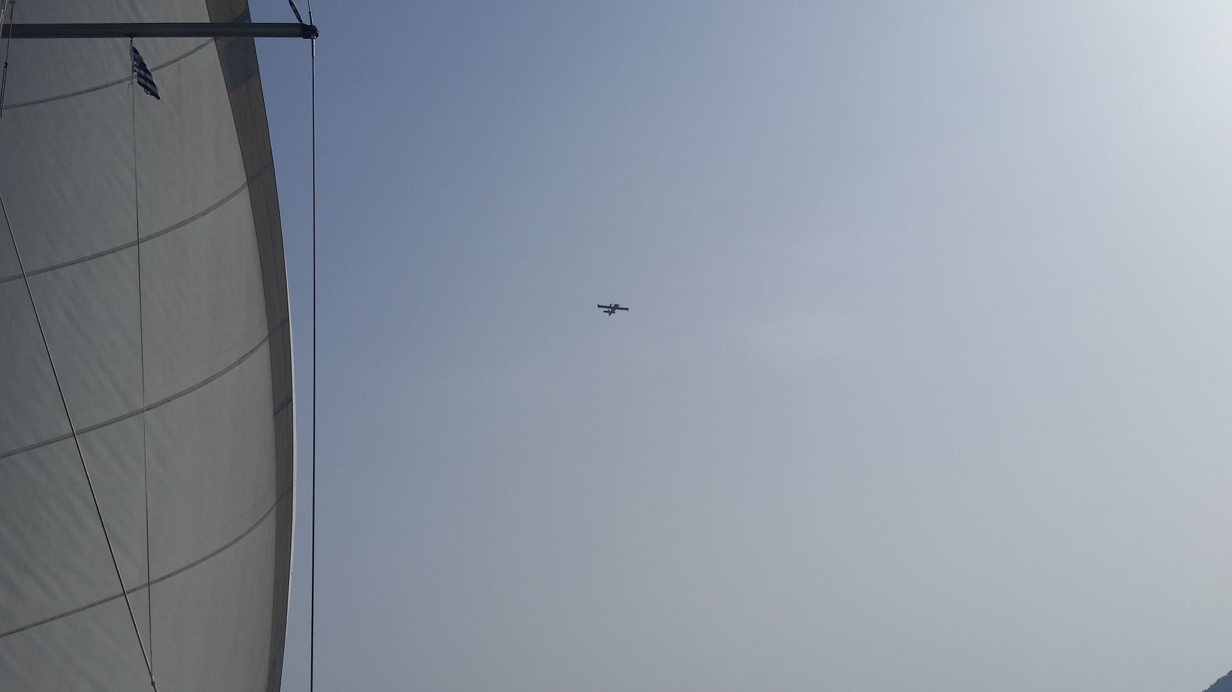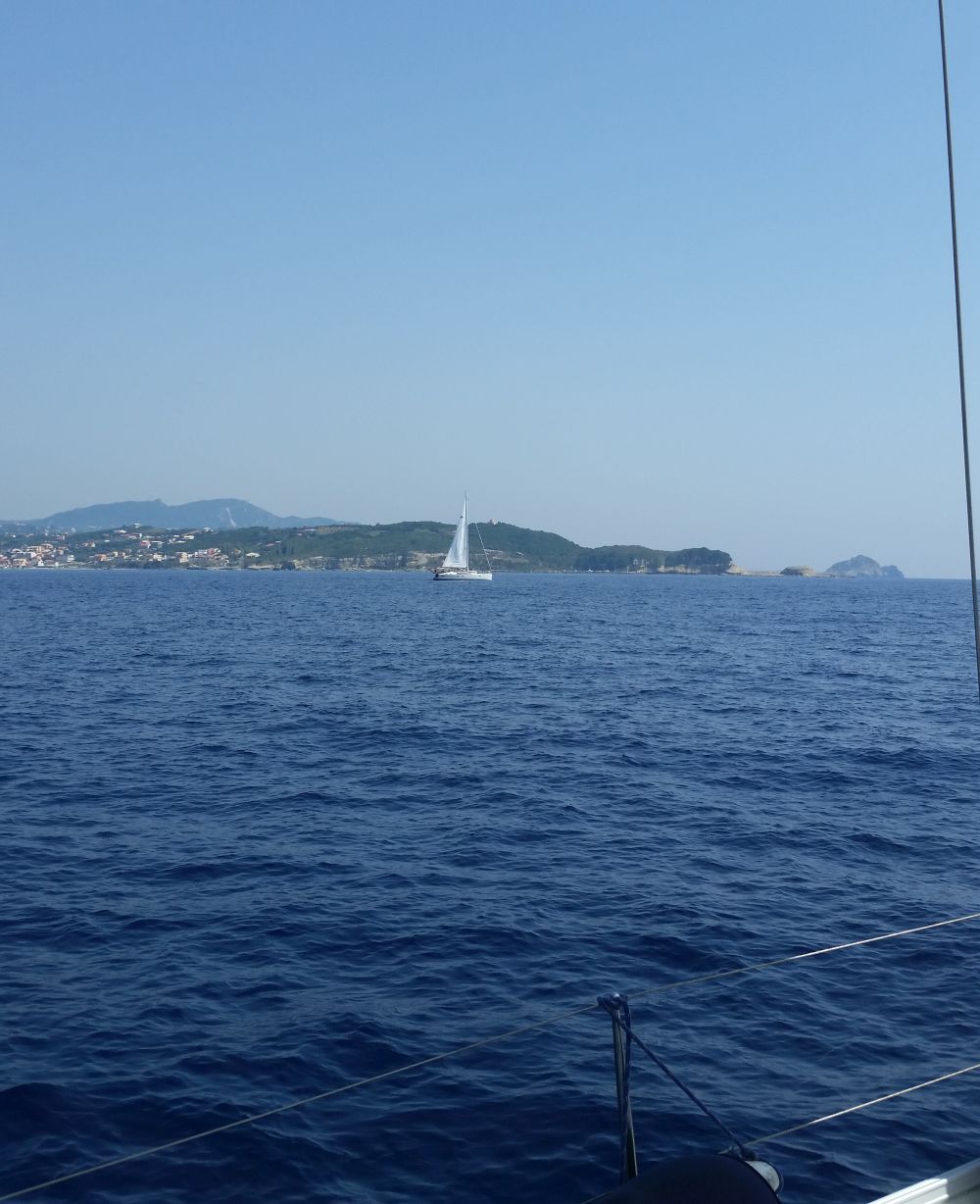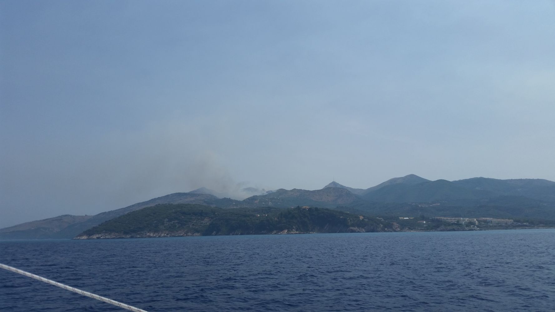 Der letzte Segeltag zurück bot dann endlich mal einen angenehmen Vorwindkurs. Aus Nebelschwaden tauchten die nahegelegenen Inseln und auch Korfu auf. Und nicht nur Nebel versperrte die Sicht aufs Land: Durch die anhaltende Dürre der letzten Monate ist die Waldbrandgefahr extrem hoch und leider ist nun auch auf Korfu ein Waldbrand ausgebrochen. Immer wieder konnten wir kreisende Löschflugzeuge sehen – zuerst nur in der Luft, dann auch beim Wassertanken in der Bucht vor Ipsos.
