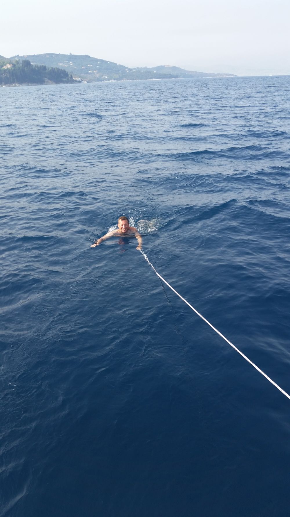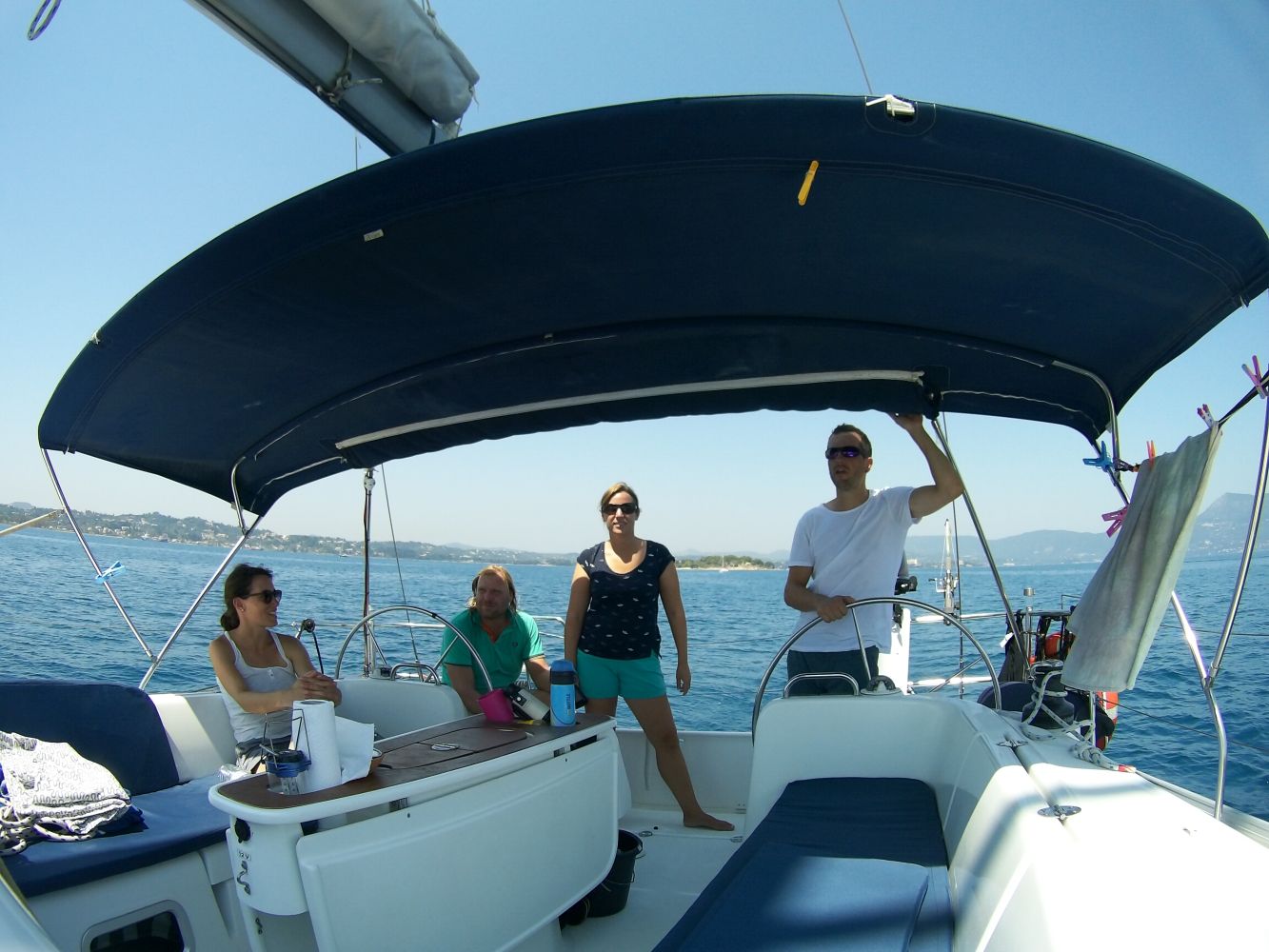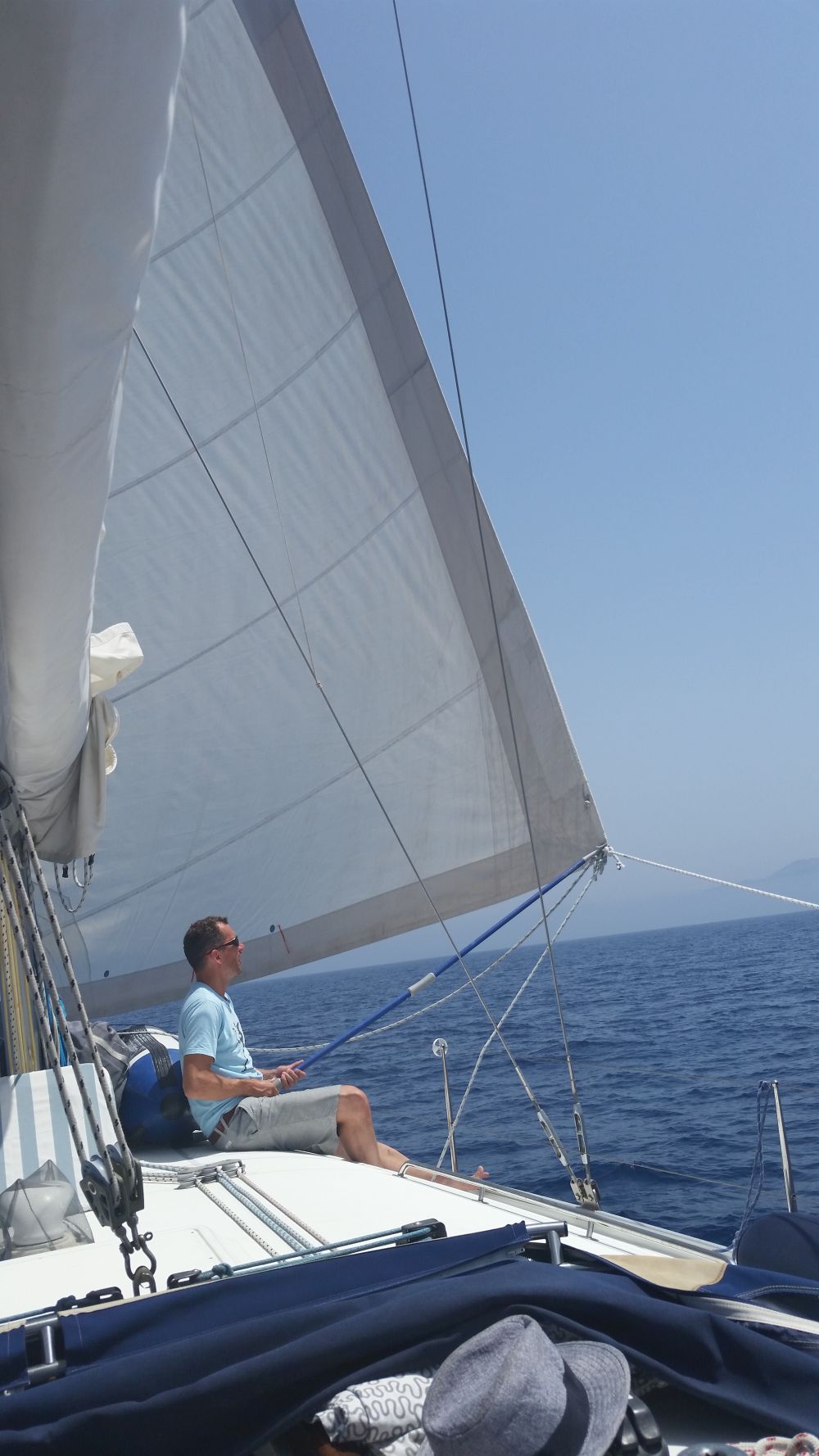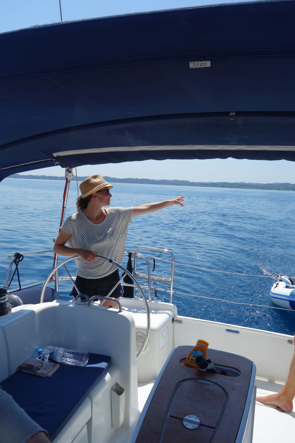 Am nächsten Tag haben wir uns dann recht früh aufgemacht und kurz nach Paxos hat Stefan seinen Hut über Bord geworfen. Sein Ruf „Hut über Bord“ verklang bei dem Wachhabenden Martina und Bekim erst einmal ungehört. Frei nach dem Motto: Da wird schon eine andere Yacht vorbeikommen und den wieder rausfischen. Nach unserer Aufforderung, den Hut doch bitte zu retten und dringend ein Trainings-Hut/Mann-über-Bord-Manöver zu fahren brach geordnete Betriebsamkeit aus und nach kürzester Zeit war der Hut zwar nass, aber wohlbehalten wieder an Bord.