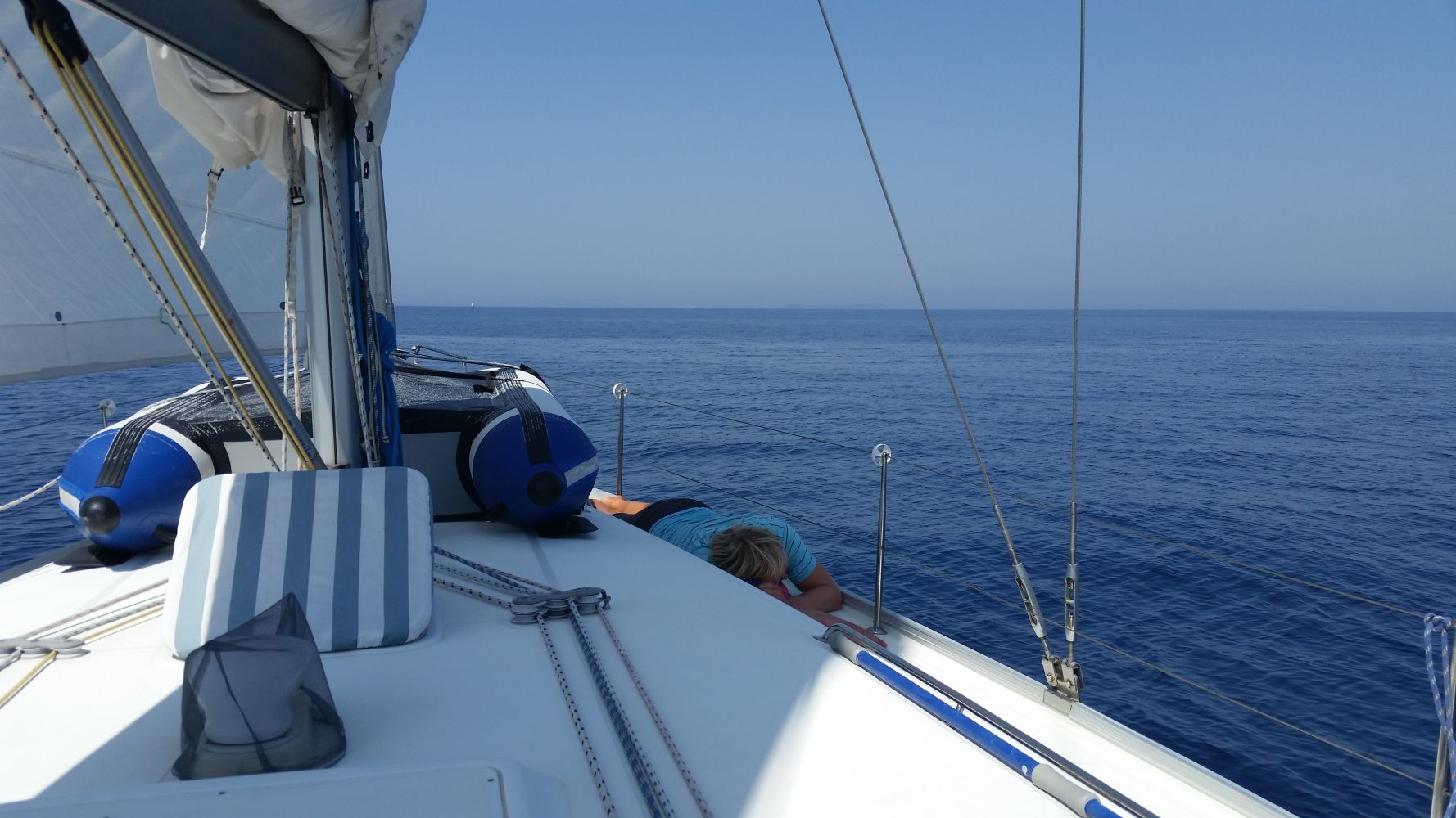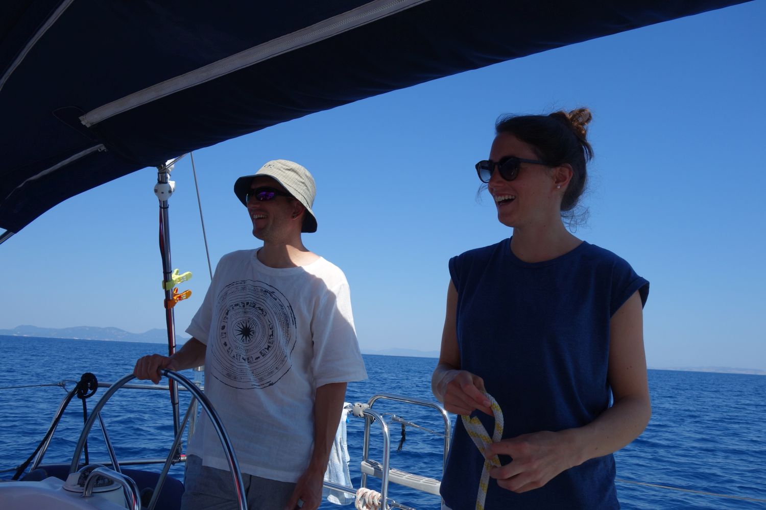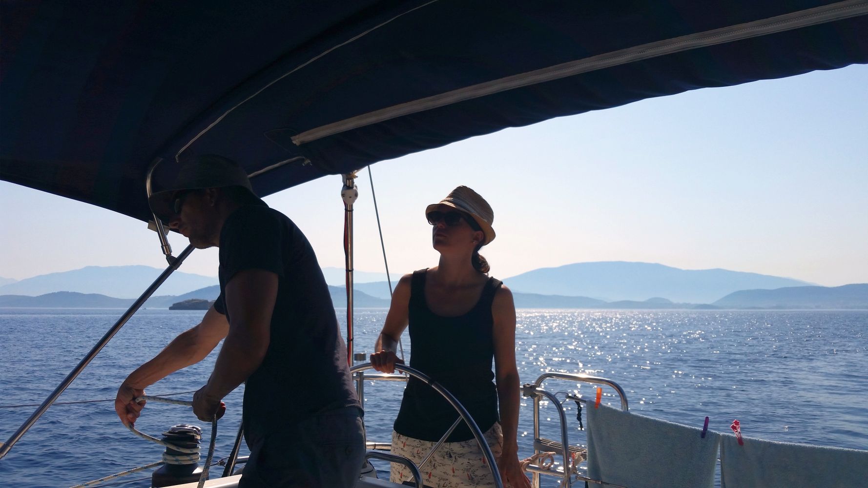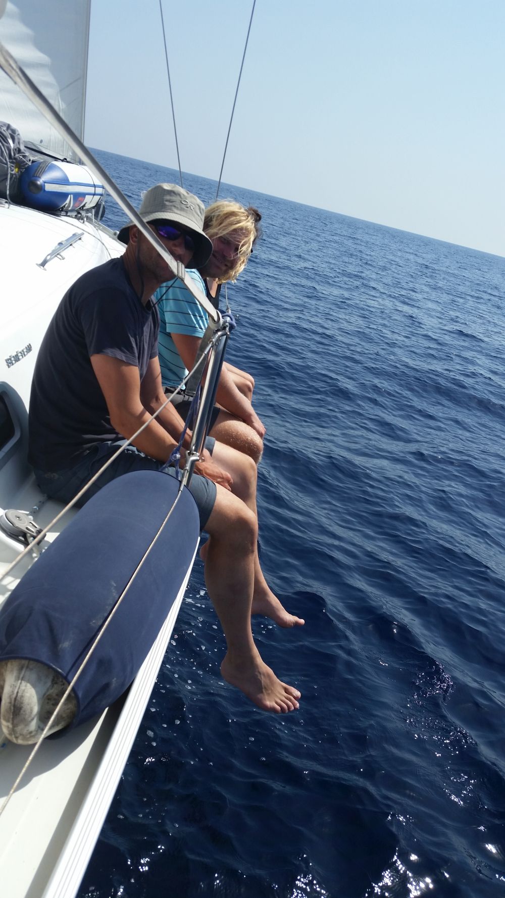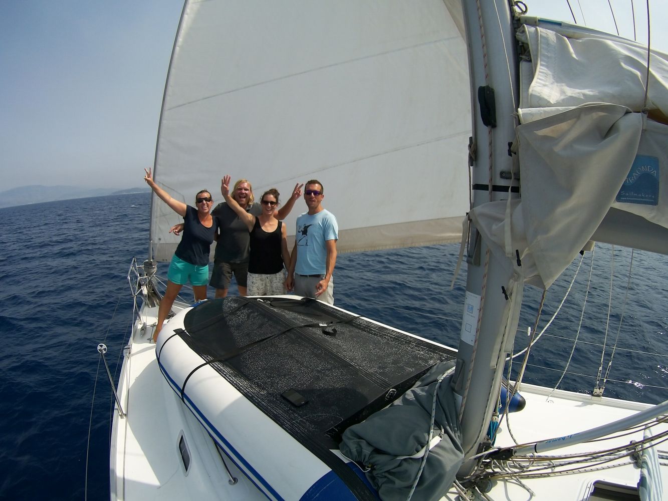 Am nächsten Tag haben wir uns dann recht früh aufgemacht und kurz nach Paxos hat Stefan seinen Hut über Bord geworfen. Sein Ruf „Hut über Bord“ verklang bei dem Wachhabenden Martina und Bekim erst einmal ungehört. Frei nach dem Motto: Da wird schon eine andere Yacht vorbeikommen und den wieder rausfischen. Nach unserer Aufforderung, den Hut doch bitte zu retten und dringend ein Trainings-Hut/Mann-über-Bord-Manöver zu fahren brach geordnete Betriebsamkeit aus und nach kürzester Zeit war der Hut zwar nass, aber wohlbehalten wieder an Bord.