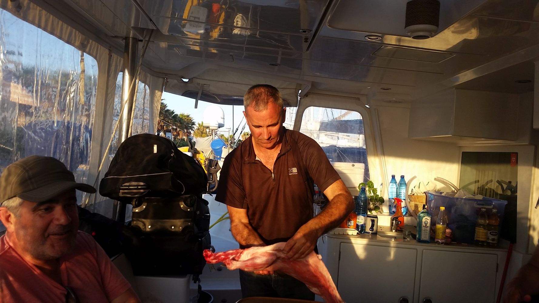 Am Ostersonntag gabs dann wieder ein Barbecue – Jamie hat ein ganzes! Lamm gekauft und spontan Bob engagiert, dieses für den Grill vorzubereiten. Irgendwie hatte er den Grill größer in Erinnerung und nach dem ersten Maßnehmen musste er feststellen, dass der für ein ganzes Lamm dann doch zu klein ist. Zu dem ganzen Lamm gabs dann noch kiloweise Gemüse, 5 kg Marzipanfrüchte und diverse verschiedene Nachspeisen. Und da sich hier in Sizilien Wasser in Wein zu verwandeln scheint, waren wir mit unseren 2-Liter-Wasserflaschen dann auch ganz zufrieden 🙂 Nur HP mopperte rum, ihm war der 2,40 € -Wein aus der Plastikflasche nicht gut genug. Nun denn – wer nicht will der hat.