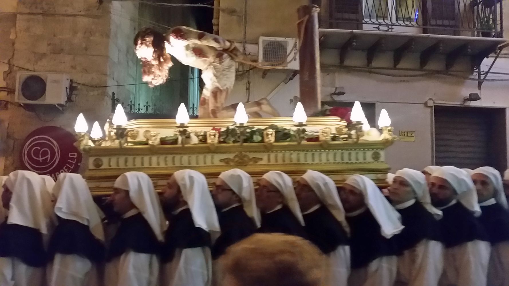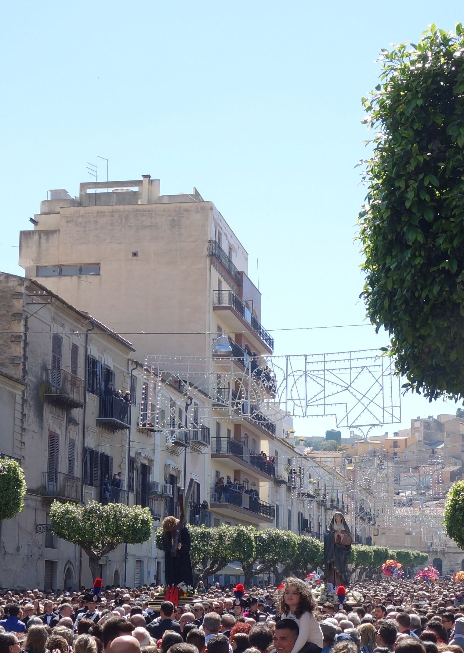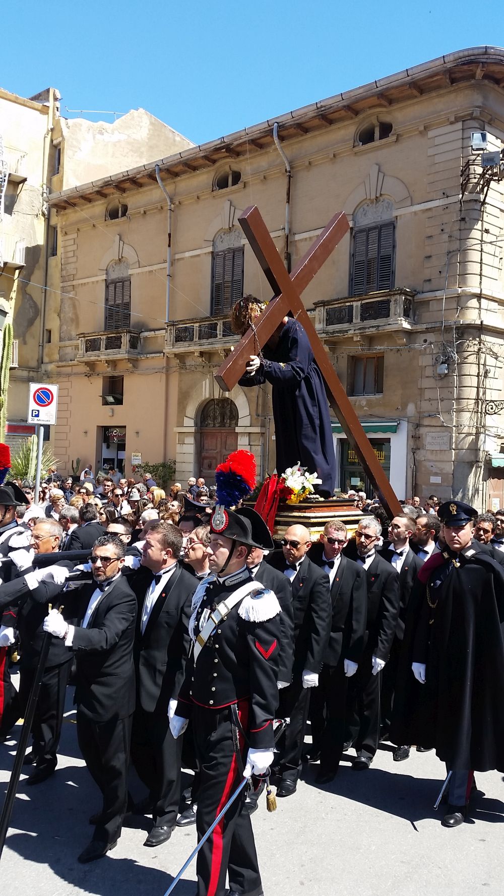 Am Karfreitag wurde dann um 3:30 (nachts) eine weitere Jesusstatue aus einer der vielen Kirchen getragen. Da ich aber ja schon um 21:00 eine Prozession gesehen habe und danach dann einfach eingeschlafen bin, musste der arme Jamie von der Sophie ganz alleine losziehen, um sich den nächtlichen Teil der Prozession anzusehen. Um 14:30 traf sich diese Prozession dann mit einer zweiten, die die Marienstatue begleitete. Viel los also – ich habe in Licata noch nie so viele Menschen zu Fuß gehen sehen. Trotz hoher Spritpreise wird hier üblicherweise alles mit dem Auto erledigt.